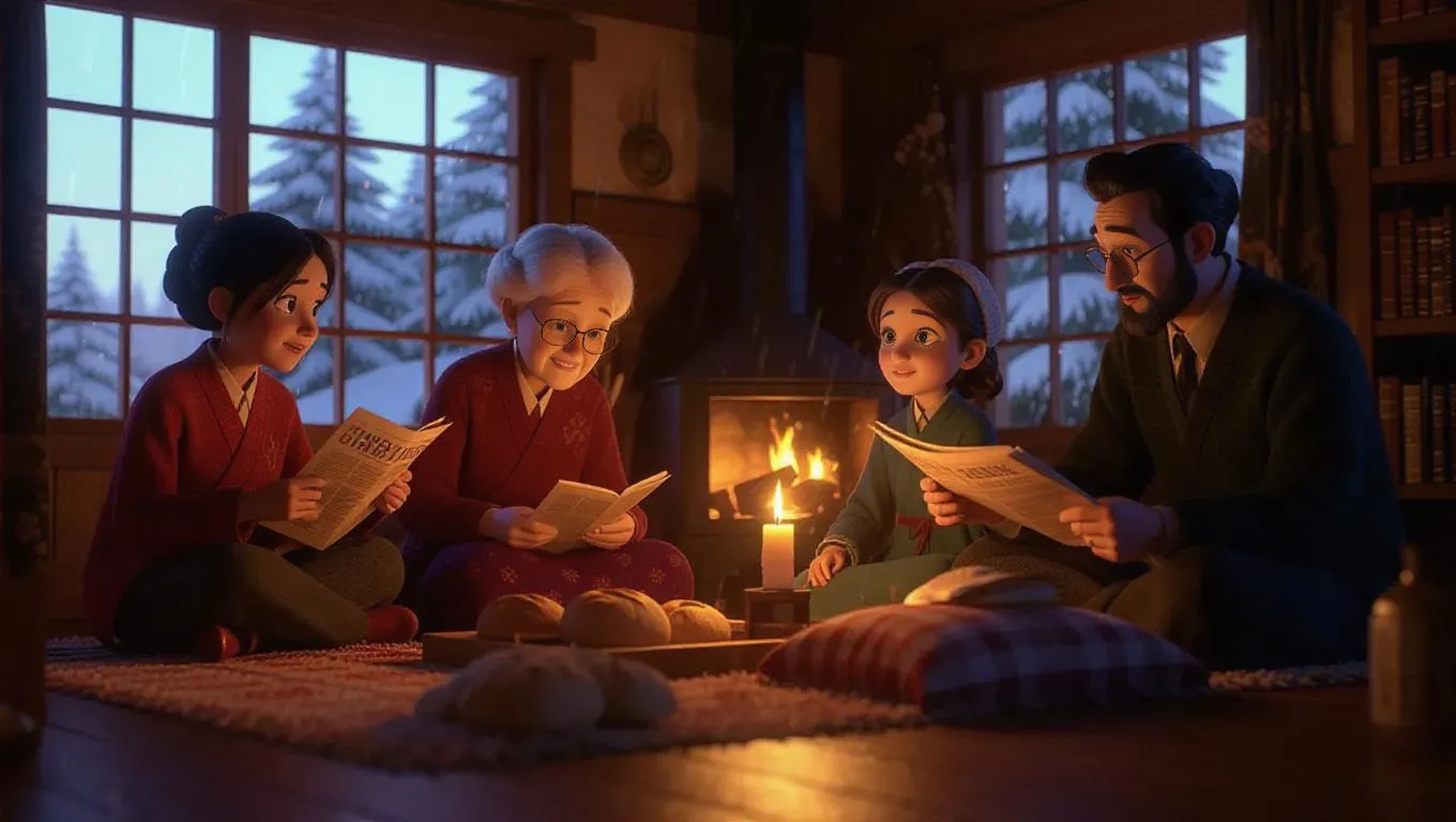 Anime family gathered in a cozy hut, the mother kneading bread by the fireplace, the father reading the newspaper near a flickering candle, the grandmother knitting wool with nimble fingers, three children sleeping soundly on a futon, rain tapping on the windows, which open and close gently from the cold breeze.