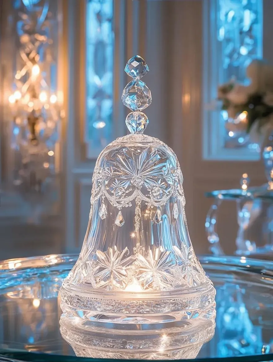 Crystal statuette of a beautifully vintage ornamented bell, elegantly placed on a crystal table, within a room adorned with crystal walls, reflecting an ethereal glow, creating a mesmerizing and otherworldly atmosphere.