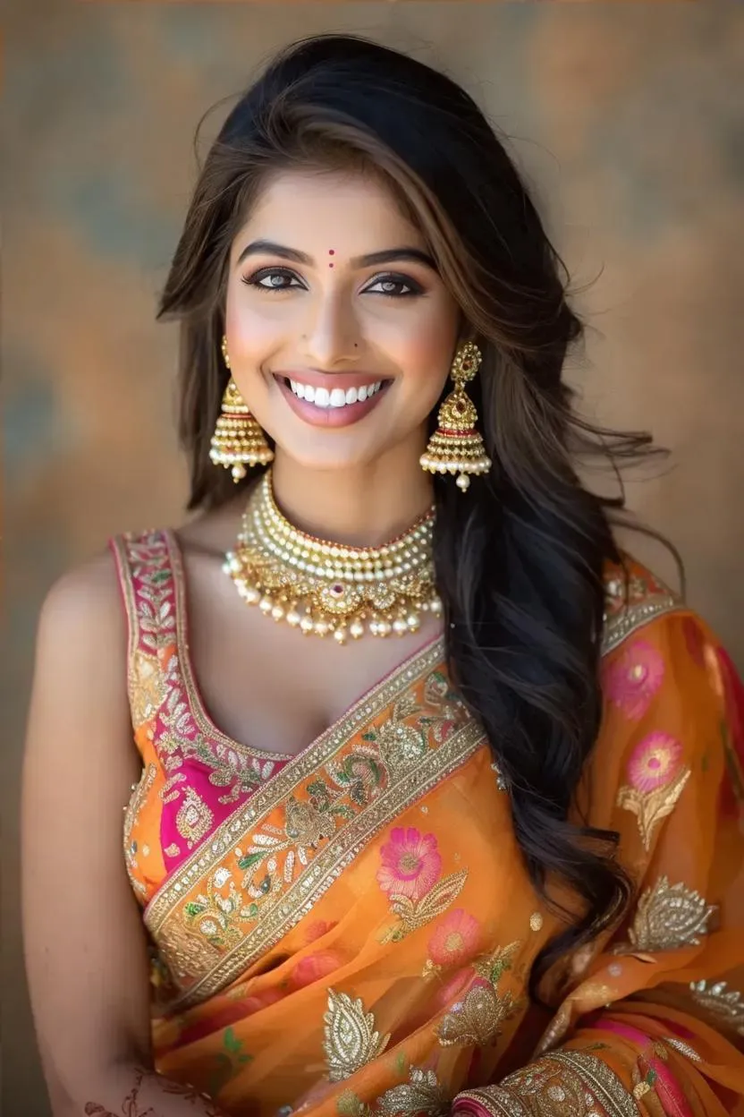 Create stunning AI-generated images of a traditional Indian beauty with flawless features, long black hair, ornate saree, intricate jewelry, and a radiant smile. Perfect for cultural art, fashion inspiration, or storytelling. Powered by VivaGo.ai's advanced AI tools for lifelike details and vibrant cultural elements.