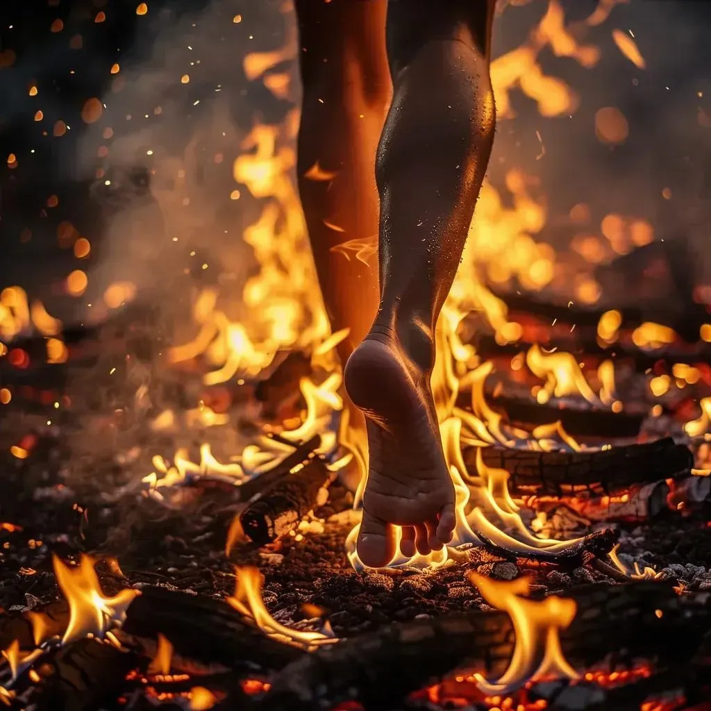 Generate intense AI imagery of bare feet walking on fire with vivago.ai. Transform text prompts into dramatic visuals using advanced AI effects for striking, professional-grade results. Ideal for symbolic storytelling, spiritual themes, or surreal art projects requiring fiery, impactful visuals.
