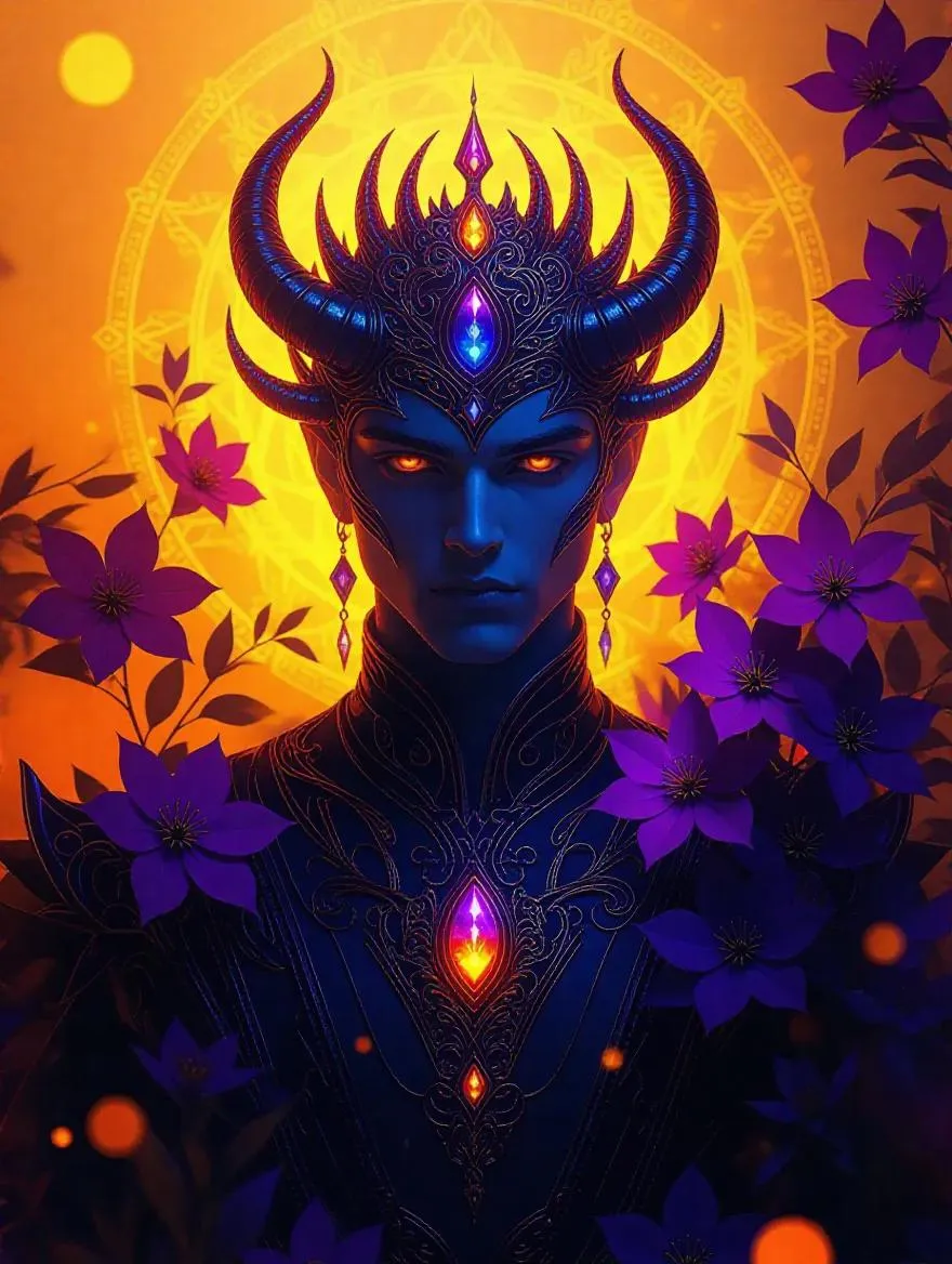 Generate a striking AI-generated portrait of Demon Lord Asmodai with a regal fantasy bloom effect. Vibrant bright-yellow, medium-blue, purple, and red hues create a mystical, powerful aura. Transform text prompts into vivid, professional-grade visuals using vivago.ai's advanced AI art tools.