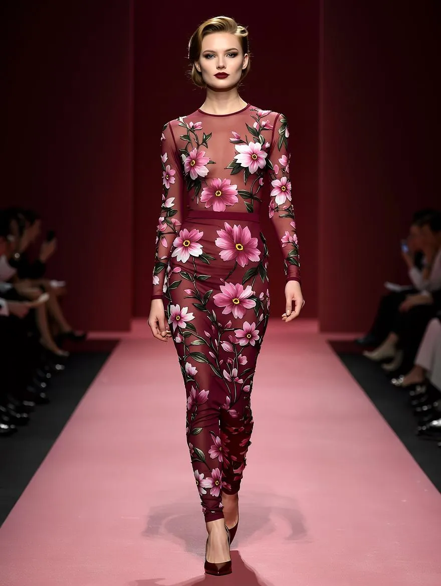 fashion model on runway wearing a bodycon printed mesh dress made with mesh in tones of wine and printded flowers walking on the runway,