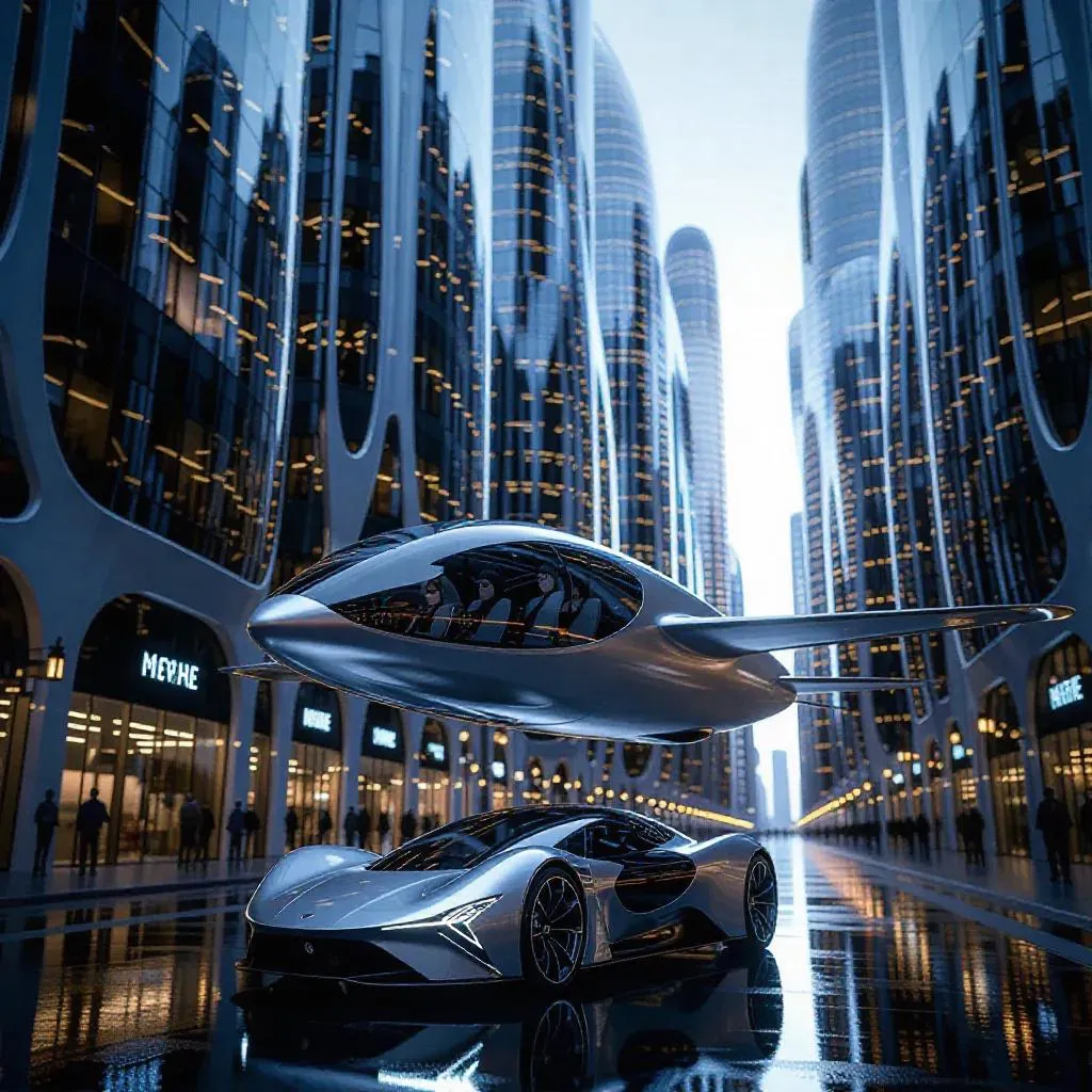 Futuristic European metropolis AI-generated imagery: photorealistic panorama of sleek skyscrapers blending organic curves and sharp geometry. Glass-metal facades reflect light, towering over wide streets with silent hovercraft transports featuring silver bodies and transparent cabins. Vibrant cityscape combines cutting-edge architecture with eco-friendly mobility for next-gen urban realism.