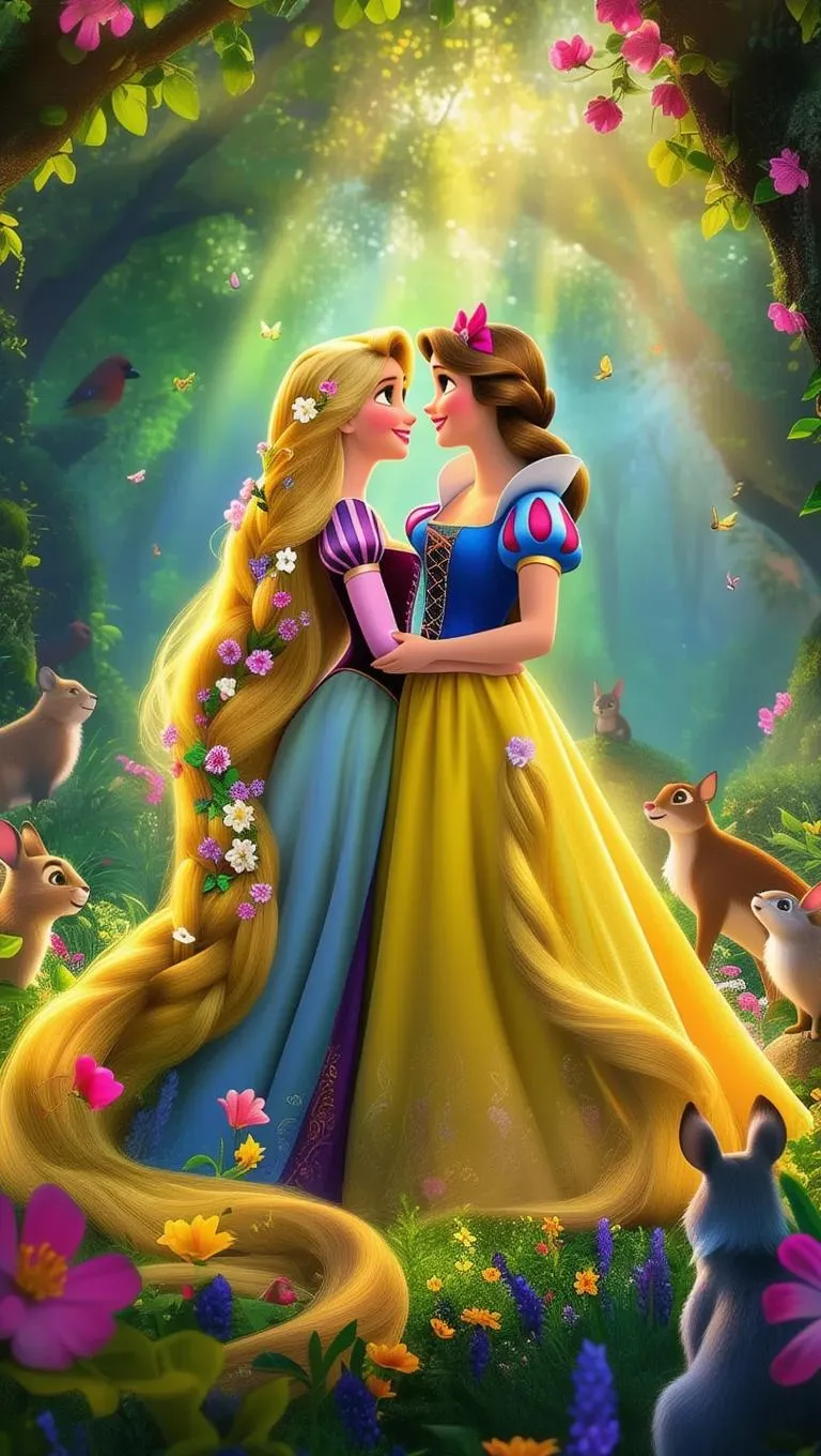 Generate magical AI art of Rapunzel and Snow White in an enchanted forest. Rapunzel’s flower-adorned golden hair and Snow White’s iconic yellow-blue dress radiate warmth, surrounded by talking animals, vibrant blooms, and sunlit foliage. Craft whimsical Disney-inspired scenes effortlessly with Vivago.ai’s AI image generator for captivating fantasy visuals.