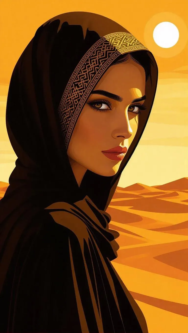 Generate a mysterious Arabic-inspired woman in stylish vector art amidst a desert oasis scene. AI-powered tools craft abstract desert motifs, daylight contrasts, and cultural elements for striking digital compositions. Elevate visuals with Vivago.ai's precision in blending traditional aesthetics and modern AI artistry.