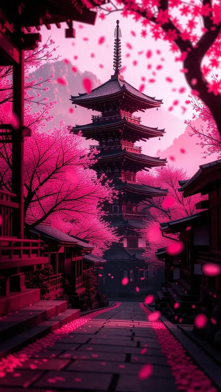Immerse in surreal ancient Japanese architecture with AI-generated pink cherry blossoms in pastel hues. Hyperrealism meets mysticism in high-definition scroll art, blending vibrant reds, deep blacks, and ethereal grays. Transform prompts into vivid visions of Japan's ornate heritage using Vivago.ai's surreal effects.