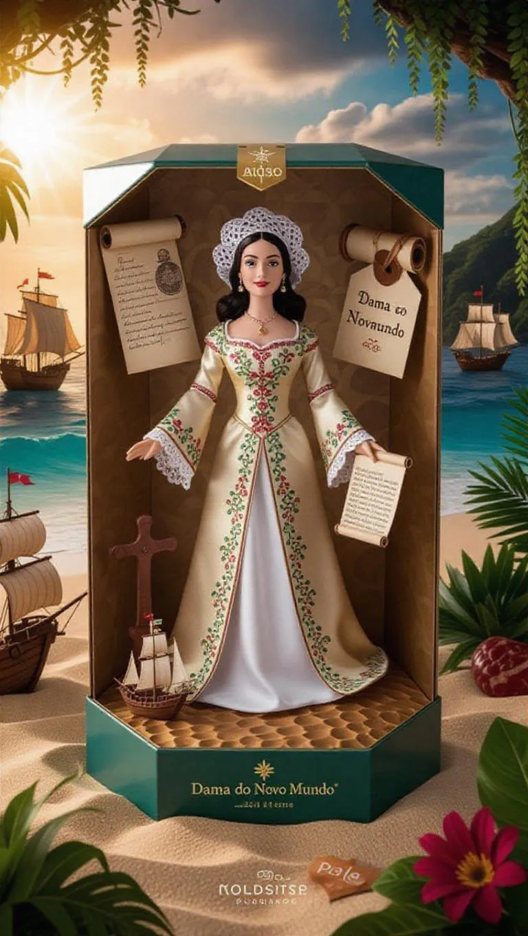 A medieval noblewoman toy, newly arrived in Brazil during the Age of Discovery, wearing an elegant embroidered gown, a delicate lace headpiece, and holding a small parchment map and a carved wooden cross. Inside her display box, she stands gracefully on a textured base resembling the sandy shores of a tropical beach. The packaging includes a miniature ship model, a rolled letter sealed with wax, and a foil 'Dama do Novo Mundo' tag. The background illustration depicts a lush coastal landscape with native flora, early Portuguese caravels, and the sun rising over the Atlantic. Soft golden light bathes the scene, enhancing warm tones and historical charm. Realistic style with romantic, adventurous elements.