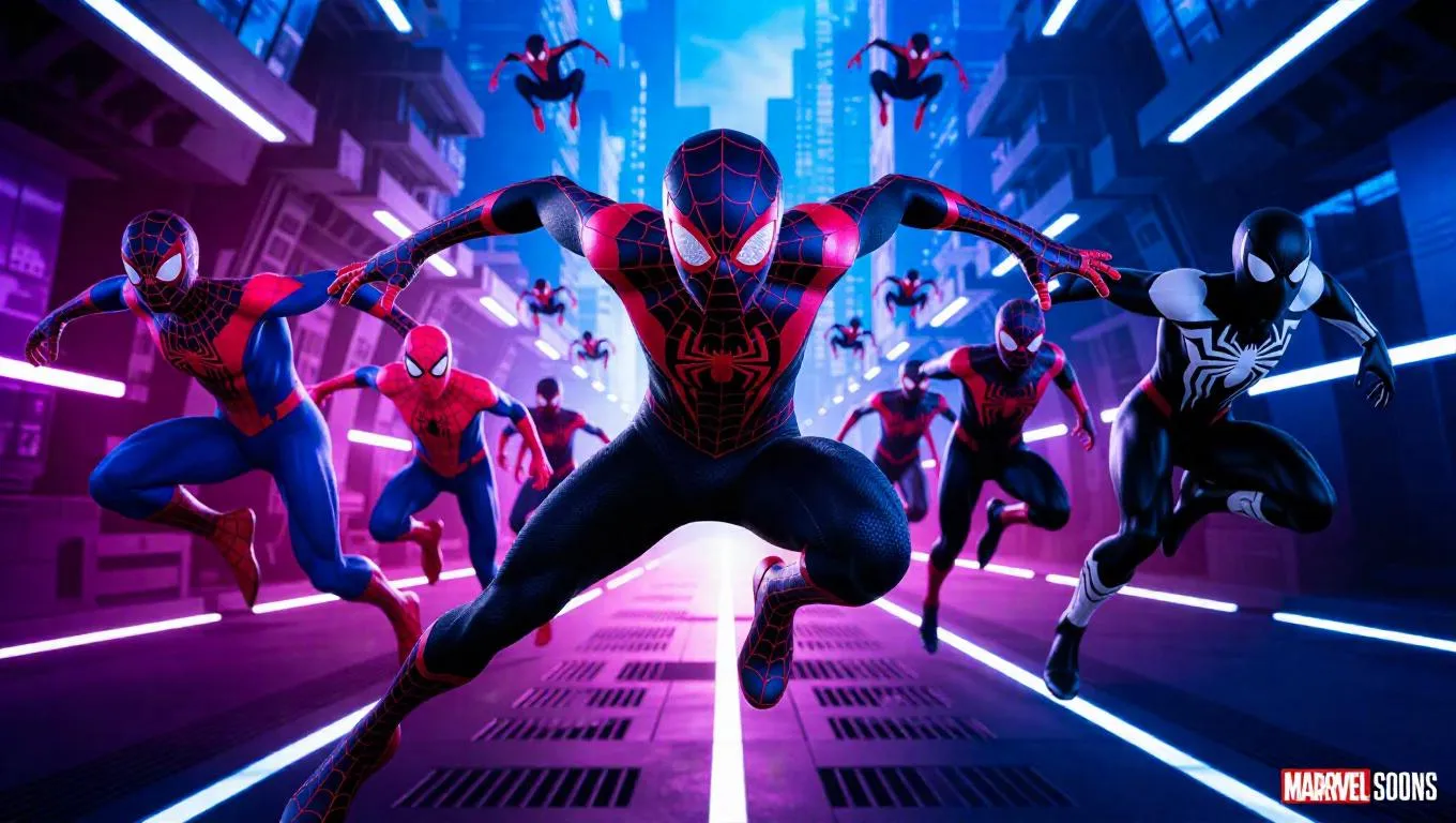 Dynamic AI-generated art captures Miles Morales in his black Spiderman suit evading a multiverse chase with Spider-Punk and Detective Spiderman through a neon-lit cyberpunk metropolis. Towering skyscrapers, flying vehicles, and dramatic lighting intensify the high-speed pursuit, blending comic aesthetics with futuristic visuals for an immersive, action-packed scene.