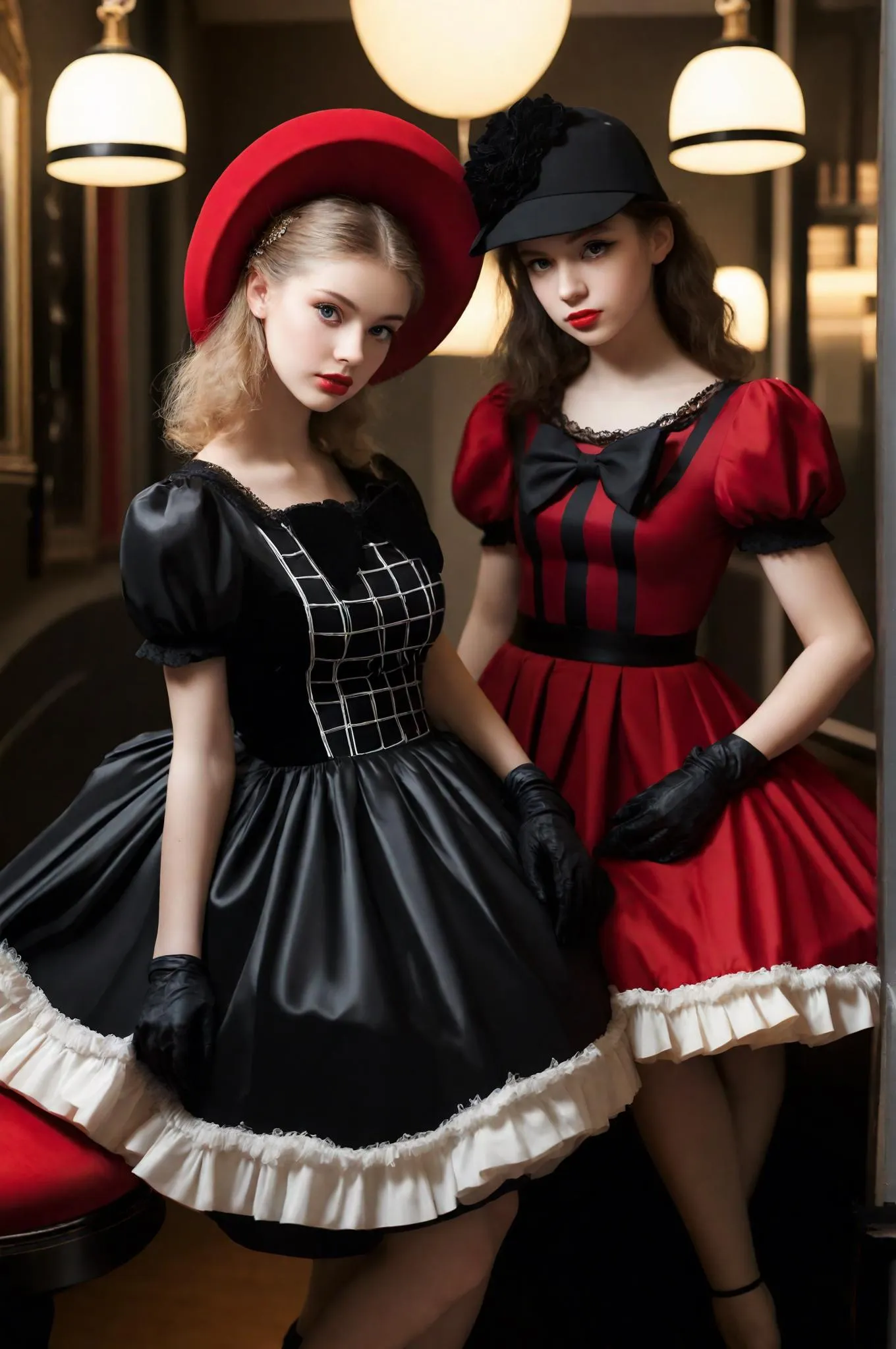 Create striking AI-generated visuals of stylish teens in bold red-black and black outfits, posing elegantly. Highlight intricate details: bow-adorned hats, patterned floors, marble backdrops. Perfect for AI art enthusiasts seeking vibrant fashion photography inspiration. Elevate your content with vivago.ai’s advanced image tools for dynamic posing, trendy attire, and modern aesthetic settings. Explore AI creativity effortlessly.
