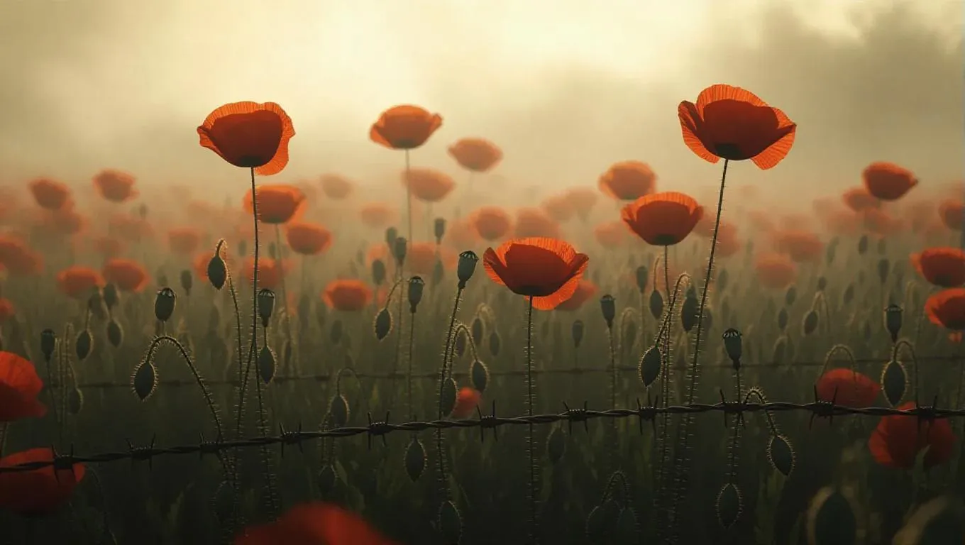 A war-torn battlefield overgrown with sentient poppies, each flower absorbing memories of fallen soldiers, projecting holograms of their lives into the smoke-filled sky, roots entangled as barbed wire, thorns dripping liquid mercury, creating an eerie and haunting landscape.