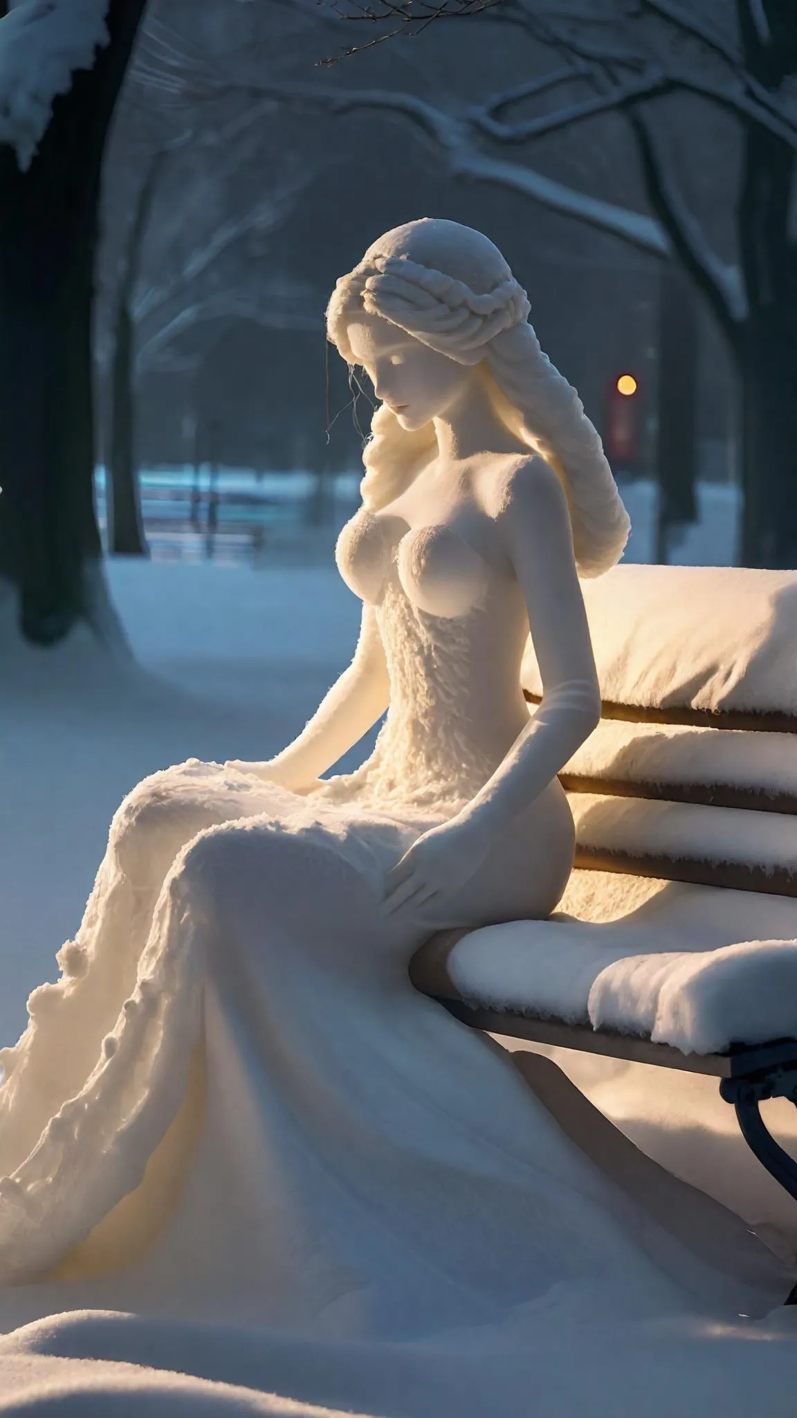 Captivating AI-generated imagery of a snow bride sculpture on a park bench at dusk. Exquisitely carved wedding dress, intricate veil, and lifelike features amidst a serene snowy landscape with glowing street lamps. Perfect for winter wedding themes or photography inspiration with AI effects. Transform your creative vision into stunning visuals with vivago.ai.