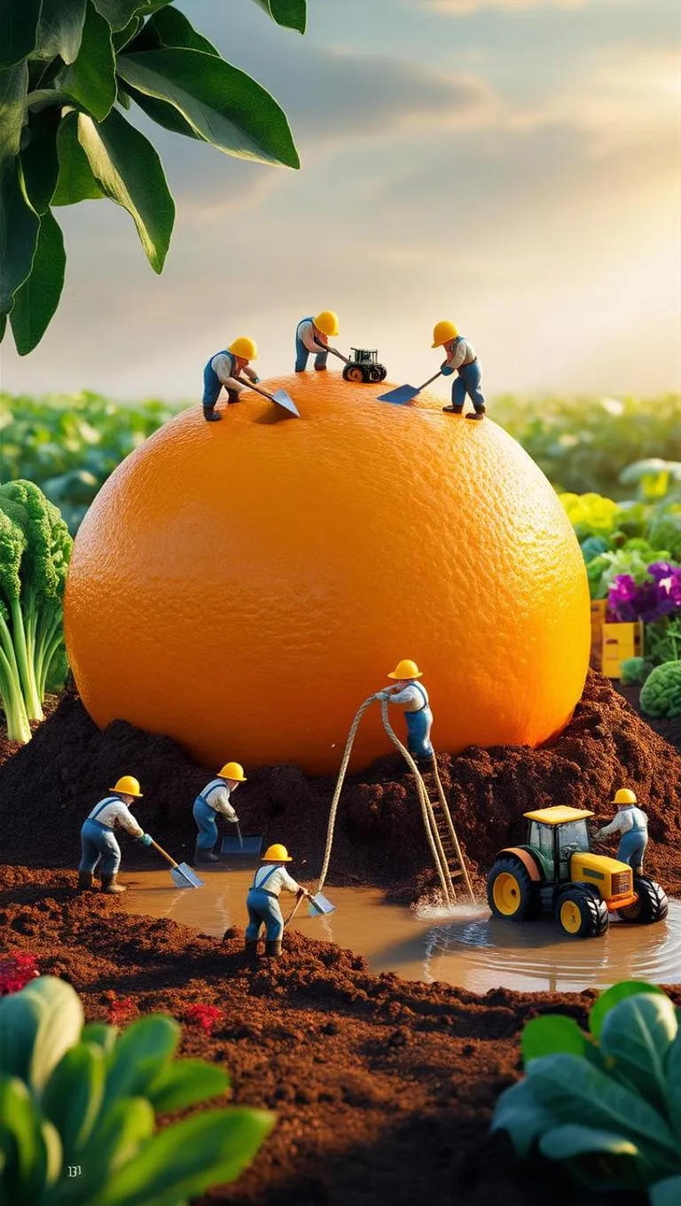 Create a magical AI-generated image of a giant orange excavated by tiny farmers in lush farmland. Cinematic scene features miniature tools, soft golden sunlight, and vibrant crops for enchanting, professional-grade creative visuals.