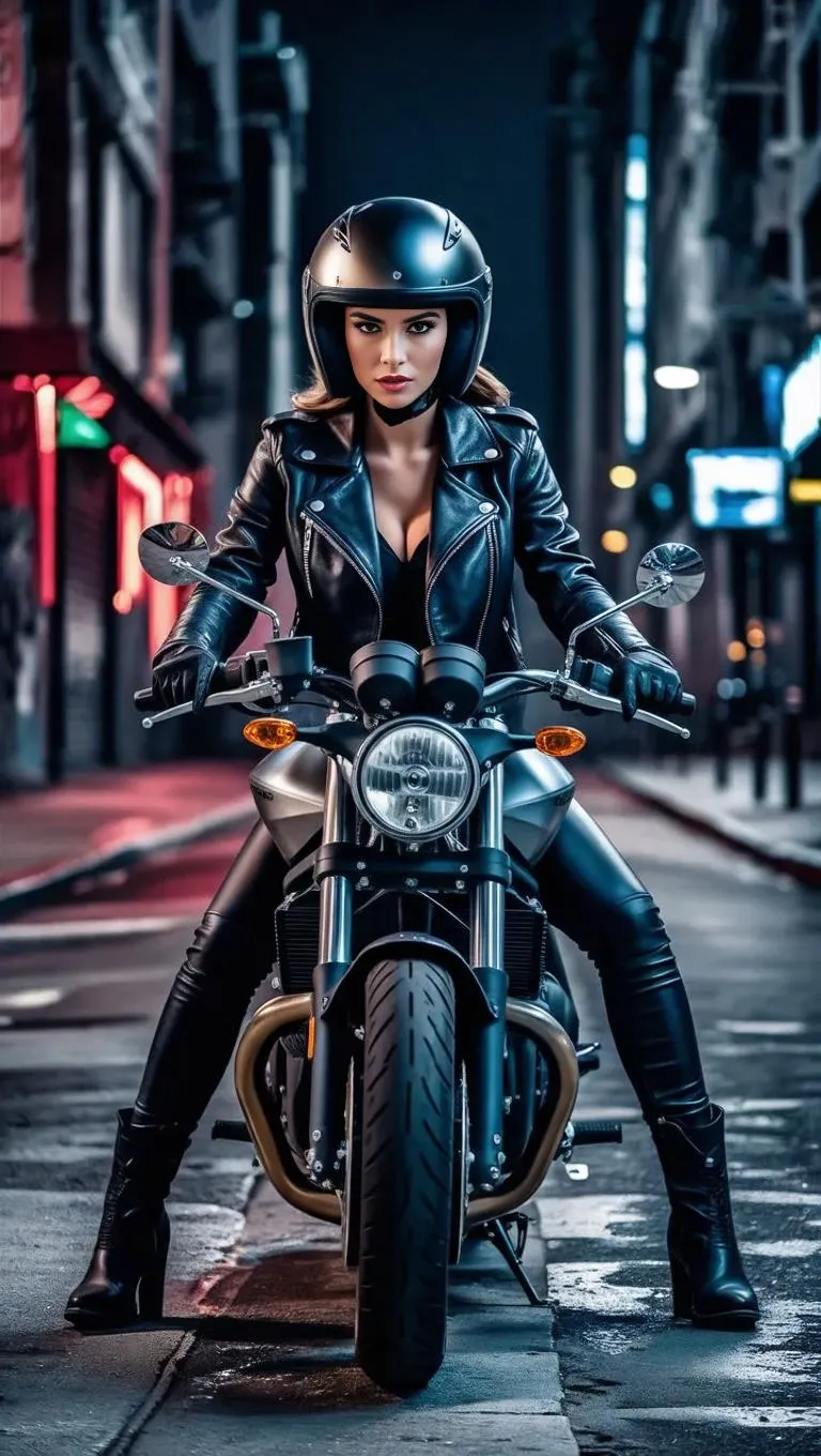 Create bold AI images of a stylish woman on a sleek motorcycle in gritty urban settings. Perfect for edgy visuals blending power, neon-lit cityscapes, leather fashion, and rebellious energy with AI-generated realism. Ideal for dynamic marketing or avant-garde art projects.