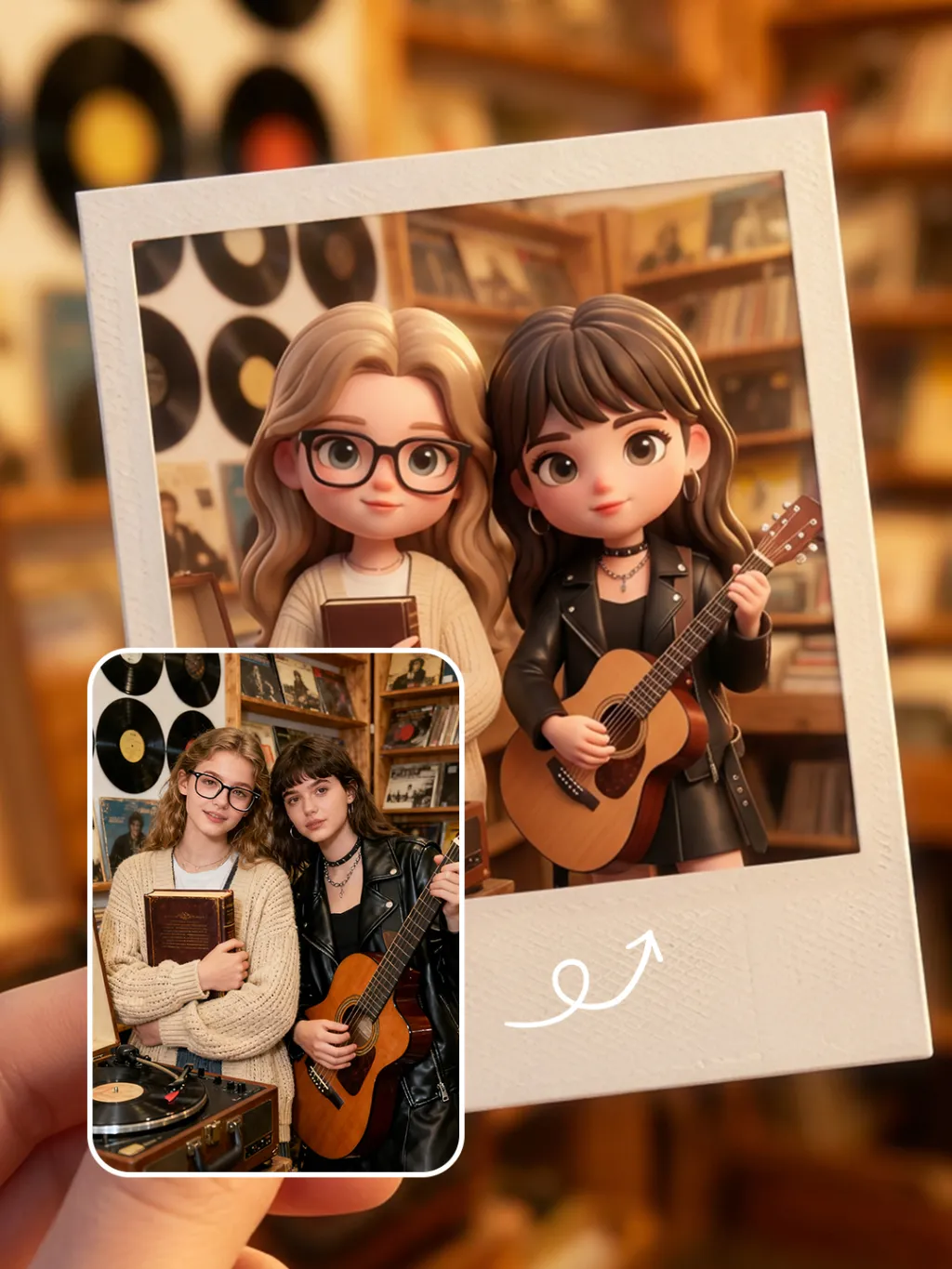 将图中的照片转换成3D Q版拍立得,主体是一张拍立得图片。图中的人物被印在白色拍立得相框里,相框被一只手握着。场景是图中的环境,光线是柔和的金色黄昏光,营造温馨治愈的氛围。用 85mm 人像镜头拍摄,背景虚化(散景),突出人物的 3D 质感和拍立得的实体细节。