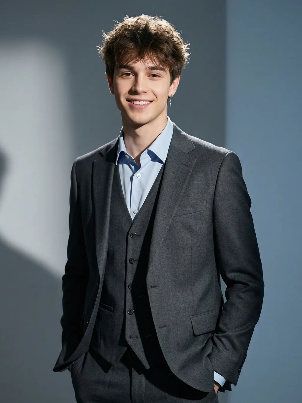Extreme close-up portrait,Head and shoulders close-up portrait (shot precisely to the chest): Extreme close-up portrait: The person in the uploaded picture (with facial features, gender, hairstyle and age remaining unchanged) has clear and detailed facial features, natural and soft side lighting, 8K ultra-high-definition quality, professional portrait photography, rich details, without excessive skin retouching. Professional fashion editors and photographers have an elegant and luxurious style. Wearing a well-tailored dark gray three-piece suit, paired with a light blue collar shirt, wearing simple silver earrings, with hands in the pockets, standing in a simple pure gray and blue solid background. Lighting: High-end professional studio lighting, projecting strong hard light from the side, forming clear and distinct shadow layers on the walls, soft fill light to retain details in the dark areas, bright edge light/ hair light to outline the figure and separate it from the background, using high-contrast film-level lighting, designed by a top fashion photographer with an award-winning lighting scheme, 8K ultra-high resolution, clear focus, fashionable and avant-garde photography art, top photography style, professional color grading, commercial advertising aesthetics, realistic and true, ultra-fine.