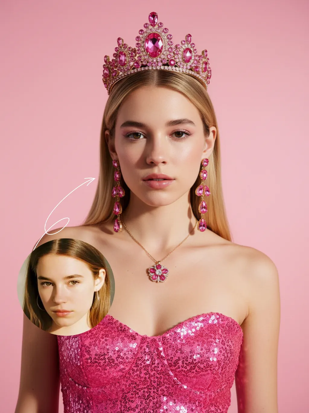 The figure from the uploaded image (unchanged facial features, age and gender) – an ultra-realistic portrait photograph, bust close-up (with natural facial retouching and a fresh sheer makeup look), centered composition, the subject in a frontal pose and gazing directly at the camera.The figure is dressed in a pink sequined spaghetti-strap dress, paired with a pink gem crown (set with a large central pink gemstone accented by small decorative gemstones), long pink gem drop earrings (designed with multi-layered pink gemstones), and a gold chain necklace adorned with a pink and white floral pendant.Shot from an eye-level perspective with high-contrast studio lighting (bright illumination, dramatic light and shadow contrast, and translucent skin texture).Color scheme: Vibrant high-saturation pink (a pale pink gradient backdrop + pink attire) complemented by gold (long blonde hair + gold chain necklace). The overall colors are vivid and cohesive, with 8K ultra-high definition and realistic skin texture. The work features an avant-garde fashion photography style and a Barbie aesthetic.
