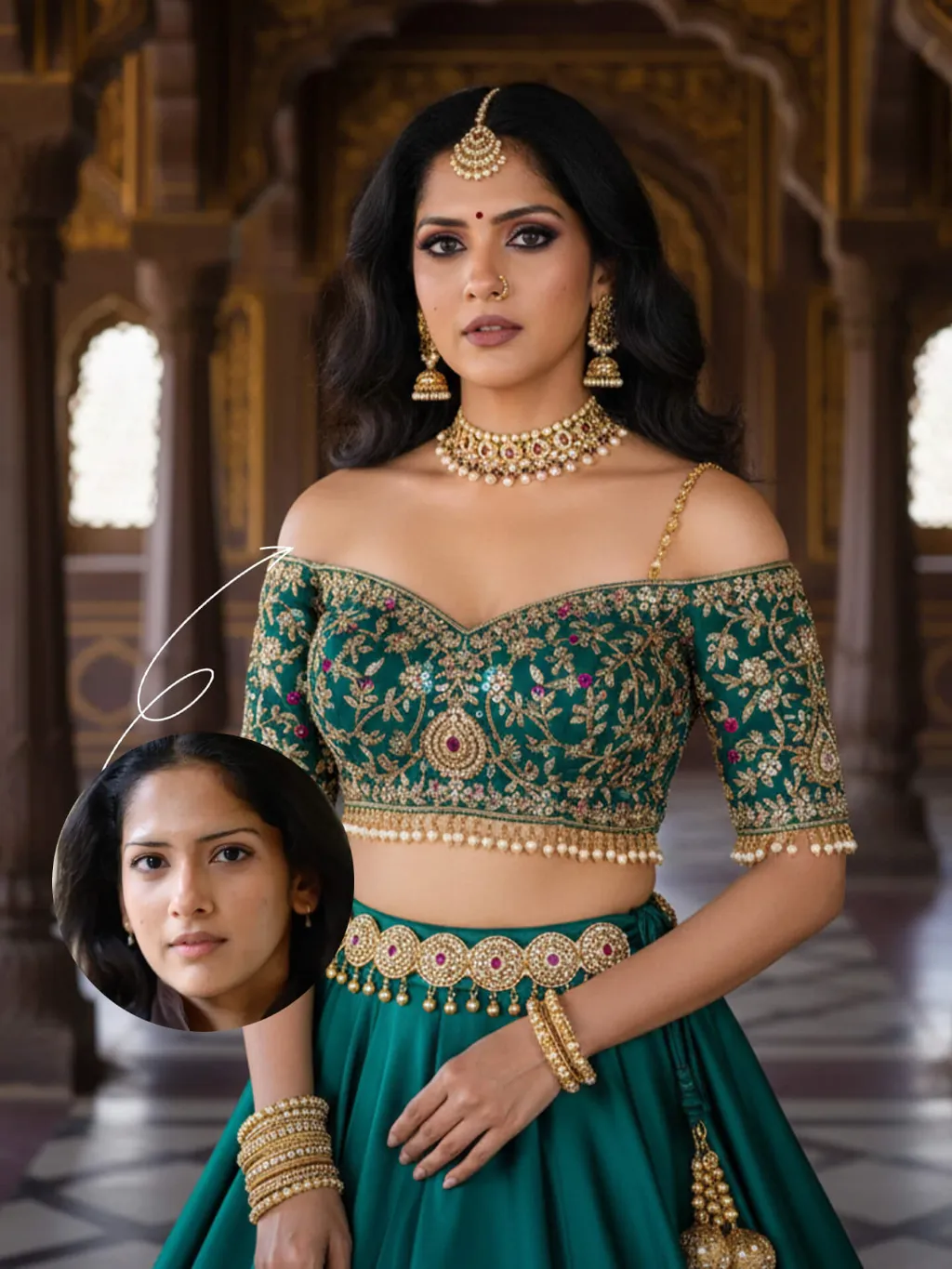 The identity of the uploaded portrait is strictly preserved (retaining facial contours, authentic Indian skin tone, hairstyle and age). This is a bust composition with a 3:4 aspect ratio, in the style of realistic and luxurious portrait photography. The subject is a stunning and glamorous Indian woman with exquisite makeup: smoldering defined eye makeup, a matte bean paste red lip, a red bindi adorned on her forehead, and a delicate nose stud on her nostril. Her hair is a head of naturally voluminous jet-black loose waves, cascading gently over her shoulders. She is dressed in a traditional Indian Lehenga Choli in deep emerald green: the blouse is an off-the-shoulder camisole crop top, fully embellished with intricate golden heavy hand-embroidery and inlaid with tiny colored gemstones including turquoise and rubies, with delicate pearl tassels dangling from the hem. The matching lehenga long skirt is crafted from deep emerald green satin, featuring a voluminous, flowy floor-length hem; an opulent Kamarbandh encrusted with rubies and gold ornaments cinches her waist, with golden beaded tassels hanging down from it. Accessory details: a maang tikka combining pearls and gold ornaments adorns her forehead, multi-layered openwork carved gold earrings frame her ears, a ruby and pearl-encrusted choker is layered around her neck, multiple layers of golden bangles and bracelets adorn both hands, and an ornate golden chain shoulder piece extends from her right shoulder. The background is the opulent interior of an ancient Indian palace: surrounded by dark brown carved stone pillars and arches, the walls are inlaid with golden floral relief carvings, and the floor is polished dark marble. Arched window lattice of the palace can be seen in the distance, creating an overall atmosphere of solemn opulence. Professional portrait lighting is adopted: the key light illuminates the subject’s entire body, while fill light refines her contours. Warm golden light casts a gorgeous and regal ambiance, highlighting the luster of the garment’s embroidery and jewelry, as well as the textured detail of the palace’s relief carvings. The style features the texture of high-end Indian palace celebration portraiture, with ultra-high definition and exquisitely detailed imagery, rich and saturated colors, perfectly restoring the aesthetics of traditional South Asia and the authentic tactile texture of the palace setting.