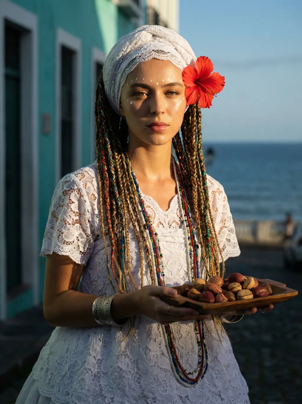 Use the exact same facial features, gender, and age as the uploaded image.Salvador Bahia cultural portrait, colonial turquoise walls, Atlantic ocean, golden hour 4:30pm, intricate tribal braids with colorful threads, white lace head wrap, red hibiscus, deep glowing skin, sacred white efun dots, traditional white lace camizu, white pano da costa skirt, silver bracelets, beaded orixá necklaces, wooden tray with kola nuts, graceful calm gaze, Rembrandt lighting, dramatic chiaroscuro, cinematic, hyper-realistic, 8K, high detail, professional cultural photography, no obvious personal pronouns