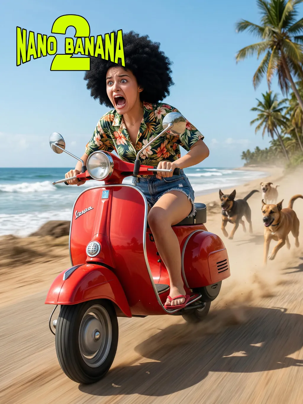 Use the exact same facial features, gender, and age as the uploaded image.Photorealistic action photograph: a young rider with thick, voluminous black afro hair, wearing a brightly colored tropical floral print short-sleeve shirt, frayed light blue denim cutoff shorts, and red flip-flops, riding a bright red classic Vespa-style scooter at breakneck speed along a coastal highway. The vehicle tilts slightly, kicking up large clouds of tan sand and dust from the wheels, while the rider leans forward aggressively with a panicked, wide-eyed expression—mouth agape, screaming in frantic determination to escape. Behind the scooter, three tan-colored dogs chase frantically, tongues lolling, legs blurred in motion, almost catching up. The backdrop features crashing ocean waves, a sandy beach, swaying palm trees, bright blue sky, and clear tropical daylight. Shot from a low angle with dynamic motion blur to emphasize speed and tension, captured using a Sony A7R IV camera paired with a 35mm f/1.4 lens. 8K resolution, ultra-fine details, cinematic action shot, with an overall atmosphere of chaos, high energy, and urgent escape.