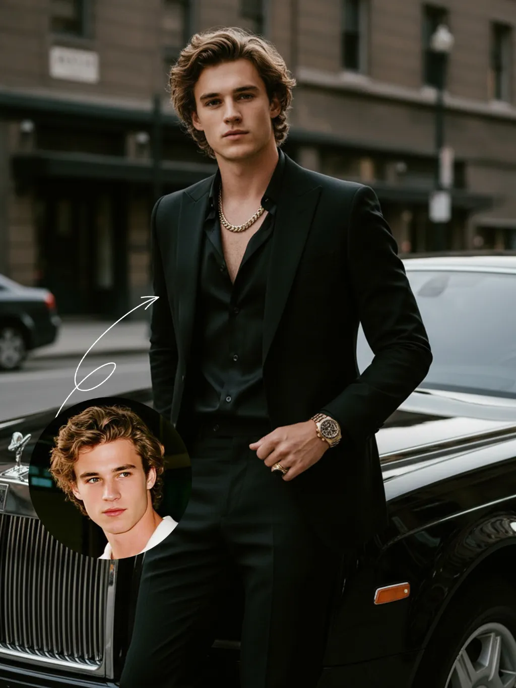 Use the UPLOADED PORTRAIT for strict identity lock (keep face, hair, skin tone, age). Cinematic portrait of a man with a tall, dashing body, with the style of a mafia boss, standing alone with an aura of confidence and authority. He is beside a luxurious black Rolls-Royce car on a city street, a relaxed pose leaning against the car showing the Rolls-Royce logo with a classy style. All-black outfit: a neat suit, an open-collar black shirt with a luxurious necklace, formal pants, leather shoes, with a luxurious ring and a luxurious watch. His expression is serious and charismatic, radiating energy like a mafia boss. The atmosphere of the photo uses low saturation color grading with a dominance of pitch black and faded gray tones, giving a dark, elegant, and classy feel ala mafia movies. The background of the city building is blurred so that the main focus remains on the man and his car. Hyper-realistic, ultra-detailed, professional photography style.