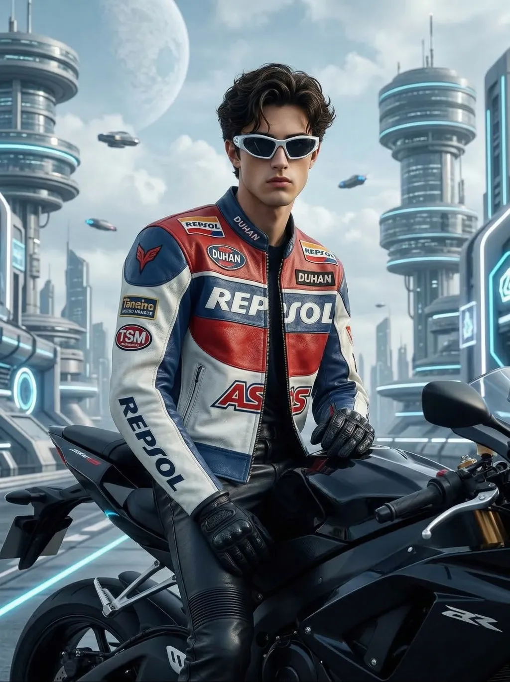 Stylized digital portrait, strictly retaining the original facial features, gender, age, and hairstyle.Stylized fashion portrait of a handsome young man, messy voluminous black hair, wearing futuristic angular white sunglasses. Dressed in a vintage racing leather jacket with red, white, and blue color blocking, decorated with multiple sponsor patches including Repsol, Duhan, TSM, and AS logos. Wearing black leather pants and black gloves, sitting sideways on a black sport motorcycle. Background is a futuristic sci-fi cityscape: floating circular skyscrapers with layered dome structures, sleek vertical towers, glowing blue and white neon accents, water canals between buildings, flying vehicles in the sky, a large pale planet visible in the bright cloudy sky, clean bright daylight, soft blue and white color palette. Cinematic studio lighting with soft side shadows, sharp focus on the subject, hyper-detailed textures of leather and hair, 8K resolution, high contrast, fashion magazine aesthetic, no text or logos on the image.
