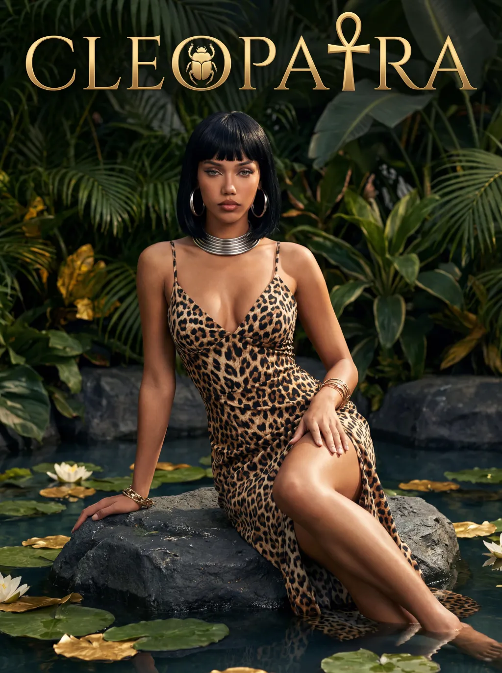 The character in the uploaded picture (unchanged facial features, gender and age). A striking woman embodying the persona of Cleopatra, captured in a close-up medium shot . She sits regally on a large, dark grey rock in a lush, tropical jungle, her body angled gracefully to accentuate her figure. She has a sleek black bob haircut with blunt bangs, a captivating gaze, and a regal, alluring expression. She wears a form-fitting leopard-print spaghetti-strap dress with a deep V-neckline and a high slit, accentuating her figure. Around her neck, she wears a bold, large silver choker necklace, and matching large silver hoop earrings dangle from her ears. She also wears gold bracelets on both wrists. She sits with one leg crossed over the other, one hand resting lightly on the rock beside her, the other on her knee, exuding a sense of poised elegance and allure. The rock is situated in a shallow pool of water, with large green lily pads floating on the surface, and delicate golden leaves scattered across the water. The background is filled with dense, vibrant green tropical foliage (like palm fronds and broad-leafed ferns), creating a lush, mysterious atmosphere. At the top of the image, the word "CLEOPATRA" is displayed in an elegant, golden serif font. The letter "O" is replaced by a golden scarab symbol, and the letter "T" is topped with a golden ankh symbol. The image is rendered in a cinematic, fantasy art style, with dramatic, high-contrast lighting that highlights the texture of the leopard-print dress, the metallic sheen of the silver jewelry, and the richness of the green jungle. The color palette is rich and saturated, featuring deep greens, warm golds, and the bold pattern of the leopard print, creating a mysterious, regal, and timeless atmosphere. The overall aesthetic is detailed, evocative, and reminiscent of a fantasy movie poster