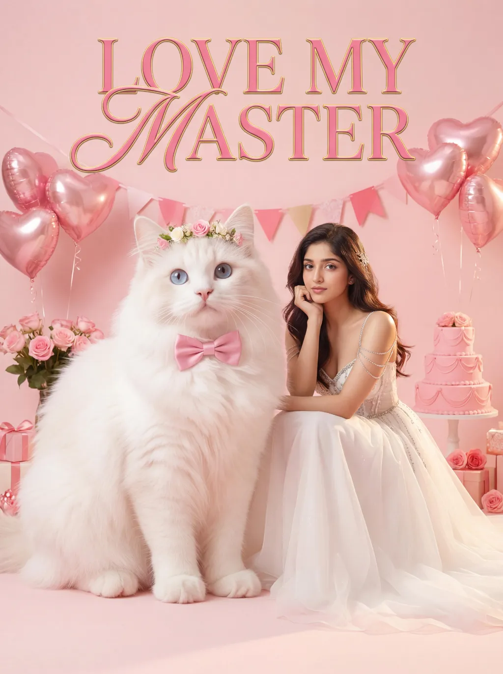 Surreal photography art: In the uploaded picture, the pet (with its features remaining the same, but its size transformed into a huge one with fluffy fur, occupying the left side of the picture and wearing cute accessories), and a person in the uploaded picture (with unchanged facial features, gender, and age) wearing an exquisite white high-end custom dress (wearing delicate accessories), places their chin on their hand and sits slightly on the ground beside the aforementioned pet, with the proportion of the pet and the person in the picture being 1 to 1; the color scheme is pink, with a natural realistic style, a photography studio photography style, the background is a simple pale pink clean photography studio background surface, surrounded by pink cakes and roses, with princess-style, Valentine's Day elements such as heart-shaped decorative balloons, a realistic pet photography style. High-key, soft, bright light, soft diffused shadows, warm low saturation tones (mutton white, pink, warm orange), creating a warm, intimate romantic Valentine's Day atmosphere between the pet and the person, fashionable avant-garde photography art, realistic film-level realistic effect, with a large title artistic design font: LOVE MY MASTER