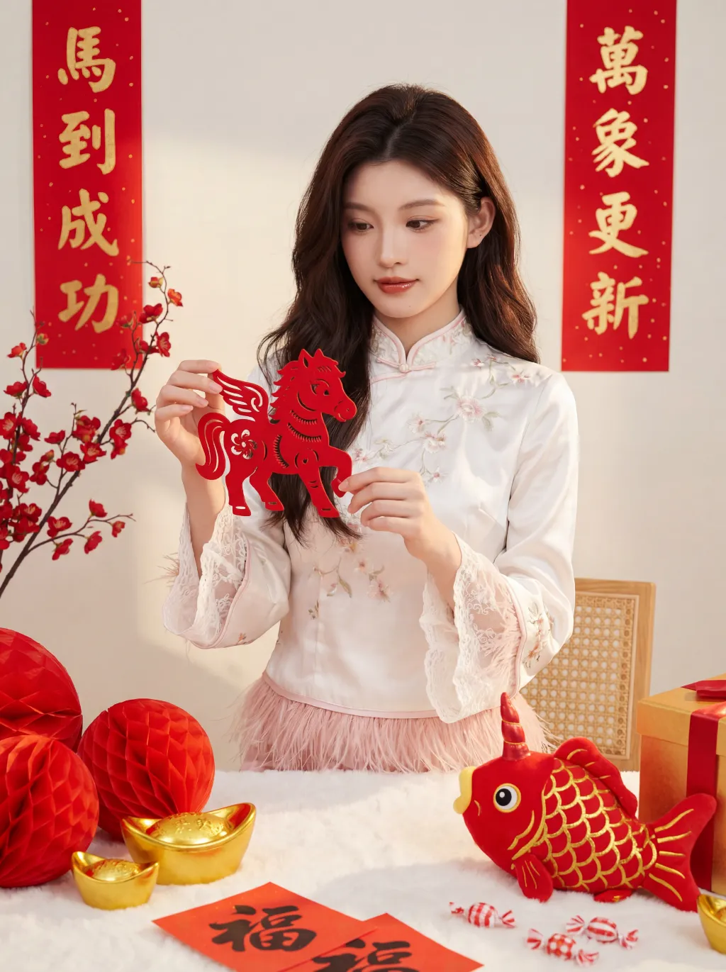 100% facial feature lock, zero deviation uploaded portrait (contours, eyes, lips, skin tone, youthful look), no facial distortion/over-smoothing, young East Asian sweet girl, standing half-body shot, standing upright, both hands holding a red paper-cut pony ornament (Year of the Horse theme) raised to chest level, head slightly lowered and focused on the paper-cut, gentle and lively posture, born-perfect base makeup, brownish-black wild eyebrows, earth-tone eye makeup, teardrop pearlescent under-eye highlights, sunflower curled long lashes, peach blush, mirror-finish reddish-brown lip glaze, cupid's bow highlighter, clean light texture, voluminous dark brown soft layered loose waves, no hair accessories, white new Chinese-style top, satin fabric with delicate floral embroidery, stand collar, lace flared cuffs, hem spliced with fluffy pink feather trim, white fluffy tablecloth, red honeycomb-pattern Fu character balls, glossy golden ingots, red fish plush toy (gold scales, red unicorn horn), red paper with handwritten Fu characters, red-white candies, red-gold gift box corner, traditional Chinese New Year scene, off-white matte wall, red gilded vertical couplets, left couplet: 马到成功, right couplet: 万象更新, positions fixed, no character changes/blurred text, red plum blossom branch, light brown rattan chair edge, clean uncluttered background, warm soft side-front natural light, subtle shadow contrast, enhance clothing & couplet 3D texture, no harsh shadows, red-gold-off-white color palette, festive warm healing vibe, Year of the Horse charm, 8K ultra HD, photorealistic, ultra-detailed, cinematic film grain, HDR, color accuracy 100%, noise-free, clear transparent 负向提示词: no swapped couplet positions, no modified couplet characters, no character blocking couplet text, no blurred couplet text, no sitting pose, no burgundy sweater, no hair bow/clips, no facial distortion/over-smoothing, no messy background, no stiff posture, no unnatural hand movements