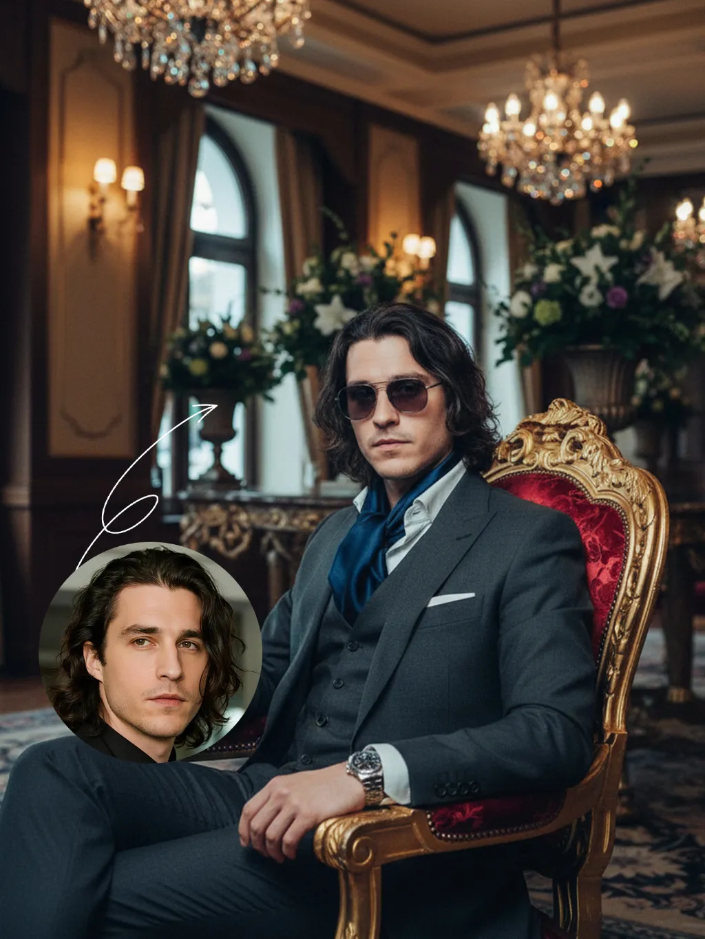 The figure from the uploaded image (with consistent facial features, hair, skin tone and age) sits confidently on an ornate golden vintage chair, holding a glass of white wine in one hand, with the other hand resting elegantly and naturally on the chair. He looks at the camera with a confident, cold and elegant expression, dressed in a dark gray haute couture suit with a white shirt underneath and an elegant textured cravat. He wears sunglasses and a watch, exuding an air of refinement, calmness and self-assurance. The background is a luxurious hotel setting with warm lighting, hanging chandeliers and floral accents, creating a retro, elegant, noble and lavish atmosphere. Captured in a medium shot from a slightly low, side angle relative to the subject, the image presents a cinematic portrayal of stylish living, featuring portrait photography aesthetics and an avant-garde fashion photography art style, with high-end cinematic texture, ultra-high definition quality, an overall cool color tone, cinema-grade image quality, a film-like filter, and dramatic lighting contrast.