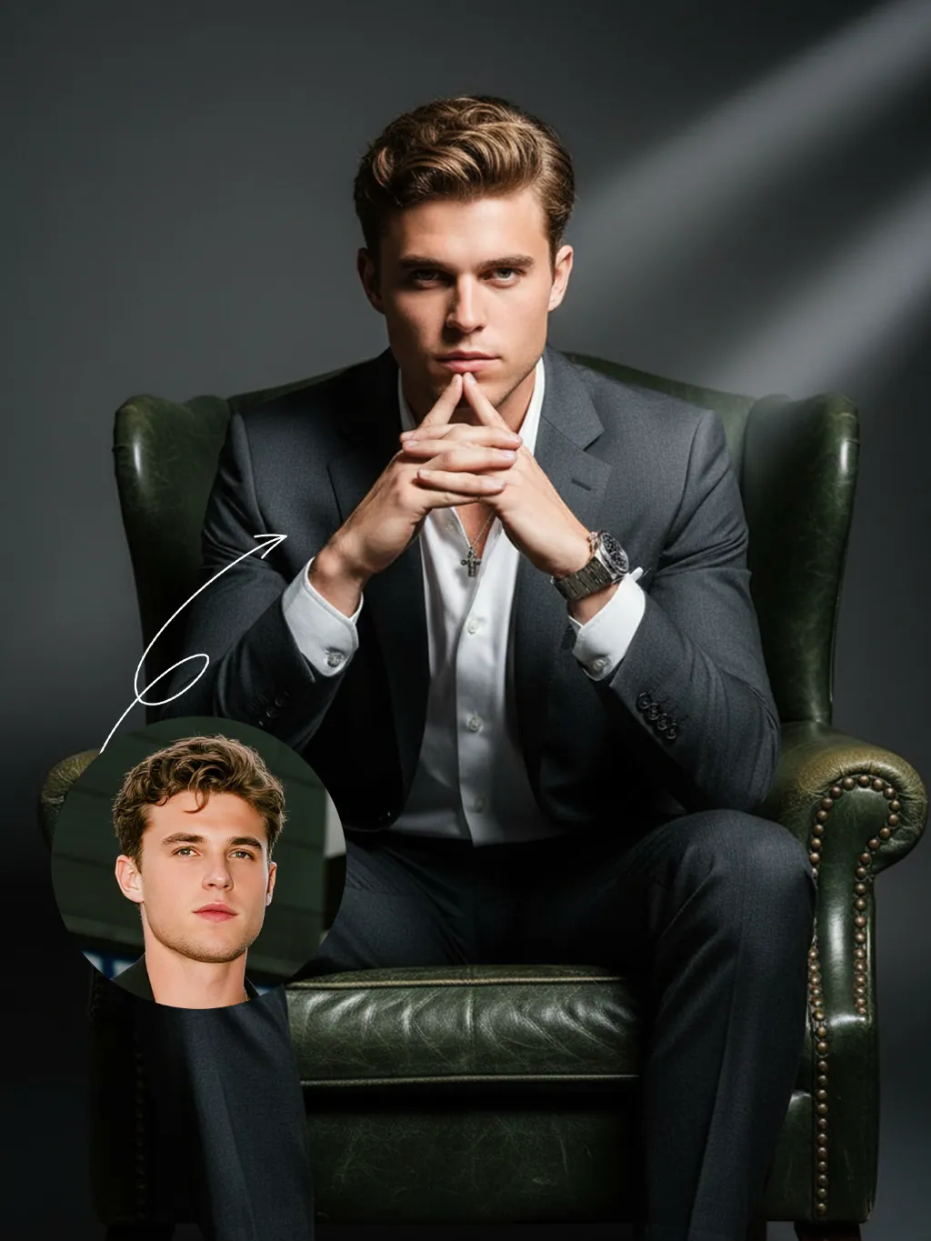 Strict identity verification is conducted using the first uploaded portrait (maintaining consistency in facial features, hairstyle, skin tone and age). An executive with outstanding poise is dressed in a haute couture suit paired with a white dress shirt (with the collar slightly unbuttoned), and a high-end mechanical watch adorns his wrist. He sits elegantly in a dark green vintage leather armchair (exquisitely embellished with delicate rivets and rich textured detailing) against a minimalist dark gray gradient background. His face exudes wisdom and focus with a sharp gaze; his hands are folded beneath his chin in a posture brimming with authority. His facial expression is confident and composed, and his eyes are piercing and decisive. A full-shot perspective is adopted to capture the subject in full view. The overall style adheres to high-end fashion commercial photography with an exquisitely fine texture. The clear texture of the suit and intricate details of the watch are sharply rendered, crafting the image of a professional, wise and self-assured corporate executive. Boasting ultra-high resolution, photorealistic detail, an editorial aesthetic, contemporary fashion photography sensibilities and avant-garde fashion photography style, the portrait features professional studio lighting with stark contrast and a dramatic dark-toned lighting effect. A broad wash of soft side light slants in from the right side of the frame, creating a large-scale Tyndall effect that outlines his facial contours with precision.