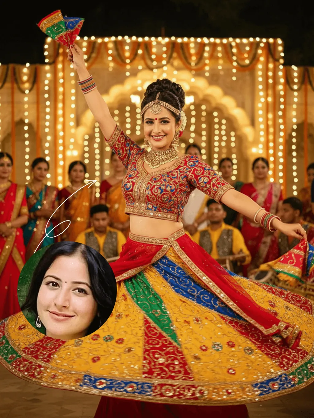 The identity of the uploaded portrait is strictly preserved (retaining facial contours, authentic Indian skin tone, hairstyle and age). This is a bust portrait that captures the original natural features of the Indian woman in the reference image: she has a delicate and radiant face with a vermilion red bindi on her forehead, her jet-black long hair styled into a traditional high bun, and adorns herself with a golden crown-shaped hair ornament, as well as exquisite gold earrings and a necklace. She is dressed in a magnificent traditional Garba dance costume: the blouse is a cropped fitted top with contrasting peacock blue and bright red embroidery, fully embellished with golden patterns; the skirt is an ultra-flared multi-layered long dress featuring highly saturated hues of bright yellow, orange-red, emerald green and sapphire blue, covered in elaborate embroidery and sequins, with the hem billowing dramatically as she dances. A red sari belt cinches her waist, and she holds a rainbow-colored embroidered square scarf in each hand. Frozen in the climax of the dance, her body stretches and spins widely—one hand lifts a scarf high, the other extends outward, and the skirt fans out in a perfect circle. She wears a brilliant smile, her eyes bright and brimming with vitality, and her posture exudes both power and rhythmic grace. The scene is a nighttime celebration for Navratri/Dussehra, set against traditional Indian architecture adorned with dazzling fairy lights and flower arches. Around her are dancers and audiences in traditional attire, with musicians playing Tabla, Tambura and other classical Indian instruments, creating an exuberant and joyful atmosphere. Warm yellow festive lights stream down from above and the sides, casting a soft halo around her figure. The sequins and embroidery on her costume shimmer brilliantly in the light, and the motion blur of the colorful skirt hem amplifies the vitality and ambiance of the frame. Boasting 8K ultra-high definition resolution and commercial-grade portrait quality, the image features rich, saturated colors and crisp, distinct details, highlighting the fervor of the festival and the infectious power of the dance.