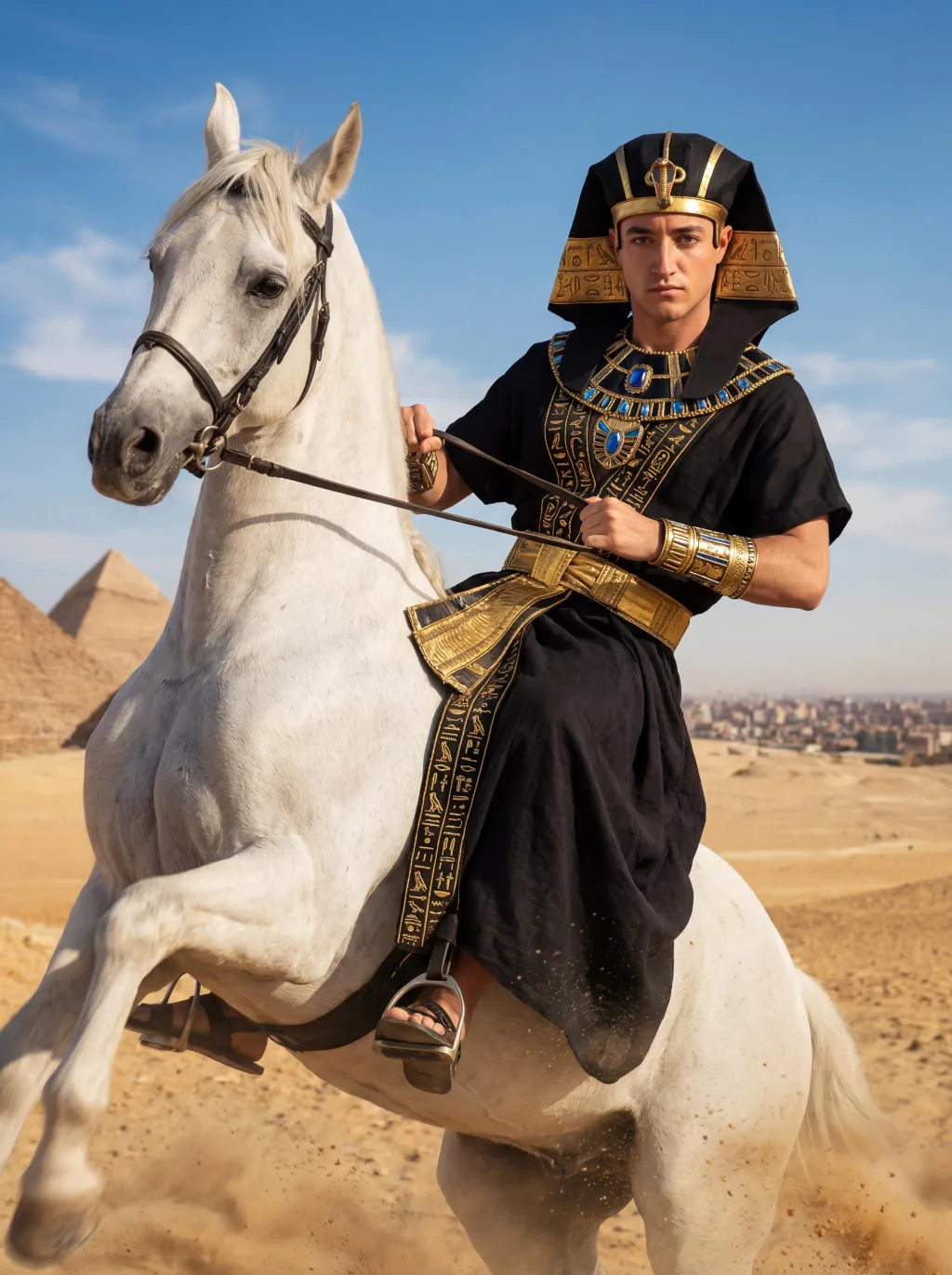 The character in the uploaded picture (unchanged facial features, gender and age). A striking young man embodying the persona of an ancient Egyptian pharaoh, captured in a hyper-realistic, cinematic portrait. He has short dark hair, now adorned with an elaborate black and gold nemes headdress, featuring intricate golden hieroglyphic carvings and a central golden cobra symbol, replacing the original golden headdress, exuding divine authority. He is clad in a form-fitting, floor-length black linen robe, intricately embroidered with golden hieroglyphic patterns along the hem and sleeves, accented with a wide, textured golden belt at his waist. His accessories are opulent yet dark-toned: a massive, multi-layered black and gold pectoral necklace with blue gemstone inlays, and intricate golden arm cuffs on both wrists, replacing the original golden accessories. He is mounted atop a powerful white horse that rears dynamically in the desert, kicking up a spray of golden sand as it surges forward. He leans slightly back, gripping the reins tightly with both hands, his body steadying himself atop the horse, his gaze direct and unyielding toward the camera, radiating primal strength and pharaonic grandeur. The shot captures the dynamic motion of the horse and the commanding presence of the pharaoh. The setting is the vast, sun-drenched desert of ancient Egypt, with the majestic pyramids rising in the distance against a clear, bright blue sky dotted with fluffy white clouds. The desert sand stretches out to the horizon, with the warm, hazy air of the desert surrounding him, and the distant cityscape visible on the horizon. The image is rendered in a hyper-realistic, cinematic photography style, with dramatic, natural lighting that highlights the rich texture of the black linen, the subtle sheen of the golden embroidery, and the contours of his face and body, while the horse's legs are slightly blurred to convey the sense of motion. The color palette is rich and vivid, featuring deep blacks, radiant golds, vibrant blues, and earthy browns, creating a timeless, powerful, and awe-inspiring atmosphere. The overall aesthetic is bold, dynamic, and reminiscent of a grand historical epic film, blending ancient Egyptian grandeur with the raw energy of a desert ride.
