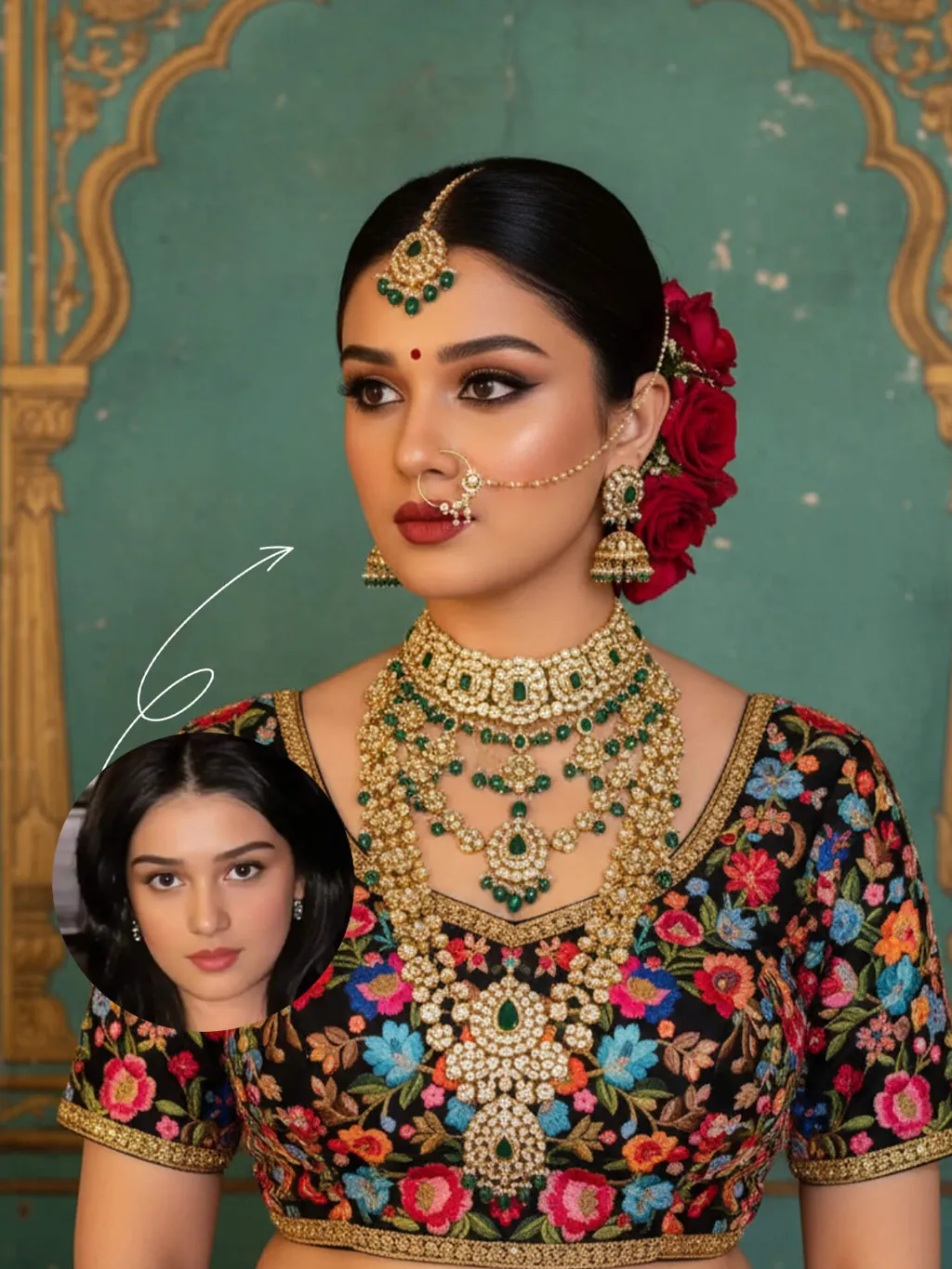 The identity of the uploaded portrait is strictly preserved (retaining facial contours, authentic Indian skin tone, hairstyle and age). This is a bust portrait with a 3:4 aspect ratio, featuring an elegant and opulent Indian bride with rich, exquisite makeup: smoldering smoky eyes paired with a matte vintage red lip, and a red crystal bindi adorned on her forehead. Her hair is styled into a sleek high bun, with lush clusters of red roses dotted on both sides and golden beading interspersed among the tresses. An ornate maang tikka inlaid with emeralds and pearls adorns her forehead, a delicately openwork gold nath graces her nostril, multi-layered dangling gold bead earrings frame her ears, and four layers of elaborate heavy gold necklaces are stacked around her neck. Ranging from a choker to a long necklace, they are inlaid with emeralds, pearls and micro-diamonds in sequence, exuding rich and luxurious layering. She is wearing a black satin blouse, fully embellished with colorful floral embroidery in red, pink, blue and orange, and trimmed with a golden border on the edges. The background is a retro painted wall in Indian palace style: with a weathered turquoise base, it is adorned with golden carved arches and patterns on top, boasting rich, saturated colors with a timeless vintage texture. Professional portrait lighting is adopted: a warm-toned key light illuminates the bride’s face and upper body, while fill light defines her contours, highlighting the luster of the gold jewelry and the color layering of the embroidery, and creating a strong atmosphere of South Asian palace luxury. The style is a retro Indian royal bridal portrait, with ultra-high definition and delicate details, rich and saturated colors, and abundant intricate textures that perfectly restore the aesthetics of traditional aristocracy.