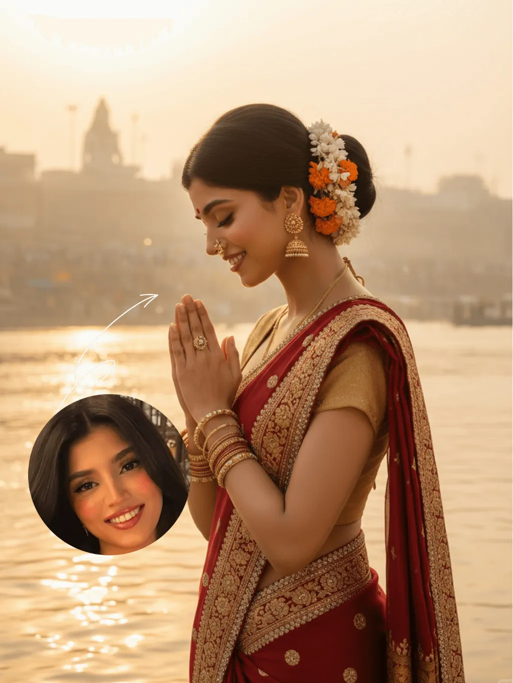 The identity of the uploaded portrait is strictly preserved (retaining facial contours, authentic Indian skin tone, hairstyle and age). This is a bust portrait that captures the original look of the Indian woman in the reference image: her sleek black long hair is styled into a traditional bun adorned with fresh jasmine and marigold blooms, she wears a gold nose ring, layered bangles and delicate earrings, with simple yet solemn makeup and a red bindi dotting her forehead. She is dressed in a vibrant red traditional sari edged with gilded embroidery and sparkling rhinestones, paired with a form-fitting gold blouse underneath, the entire ensemble exuding opulence and a strong sense of ritual. The scene is set on the banks of the Ganges in Varanasi at dawn: a light mist shrouds the glistening river surface, the golden morning sun tints the water in a warm golden hue, ancient stone ghats and crowds of devotees praying at dawn are visible in the distance, and the faint silhouette of a Shiva statue looms in the background. With her hands pressed together in prayer at her chest, eyes gently closed and a serene, devout smile on her face, she leans forward slightly, immersed in the worship ritual. The soft morning sunlight casts a sacred golden halo around her, as if she emanates a faint glow of her own; the shimmering ripples on the water blend with her halo, creating a translucent and holy atmosphere. The frame is imbued with a profound sacred ritualism and a calm, tranquil aura, boasting rich and saturated colors, 8K ultra-high definition resolution, and the exquisite texture of a commercial-grade portrait photograph.