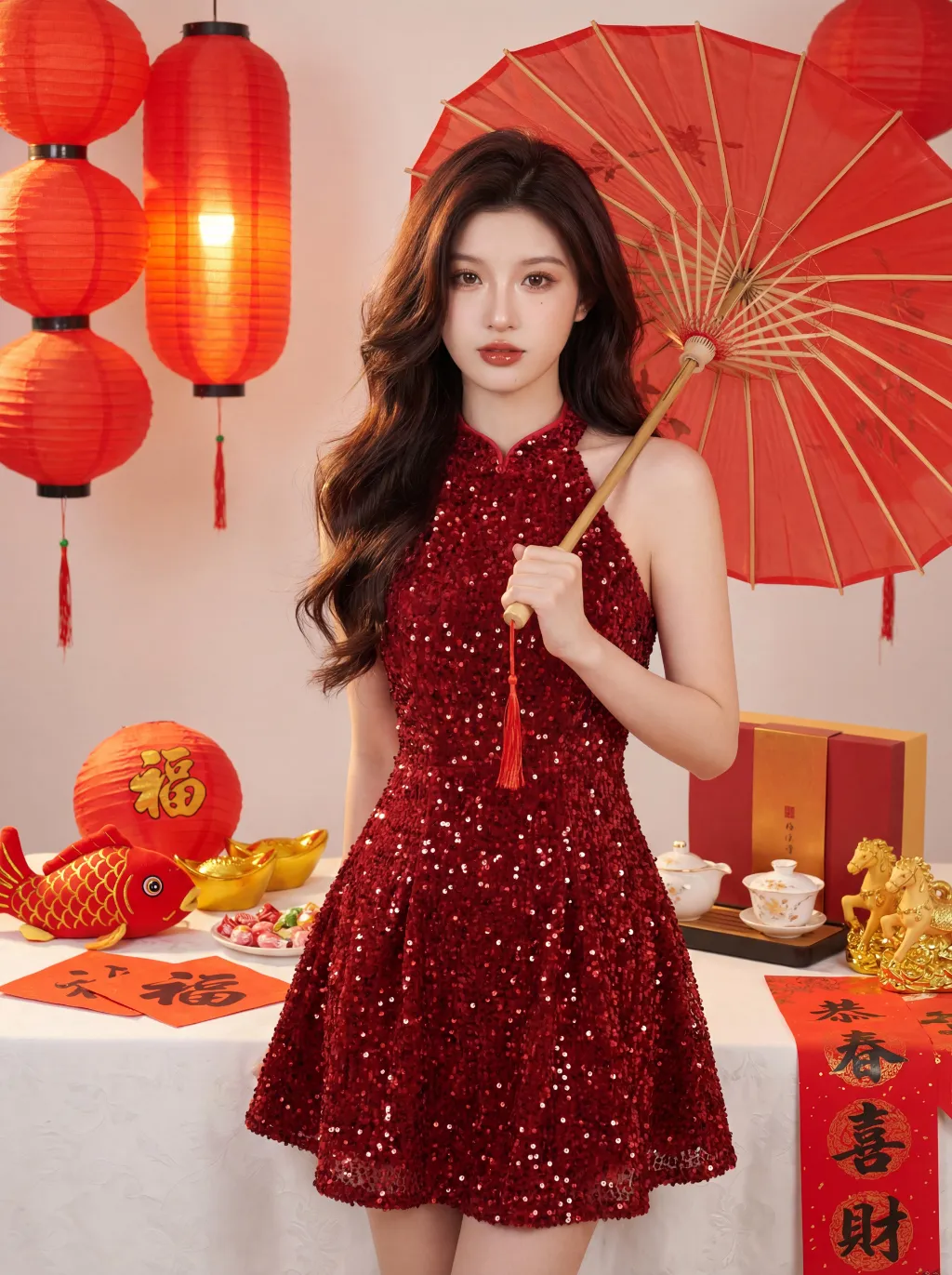 100% facial feature lock, zero deviation uploaded portrait (contours, eyes, lips, skin tone, youthful look), no facial distortion/over-smoothing, young East Asian sweet girl, standing half-body shot, standing in a side profile, right hand holding a red oiled paper umbrella slung over the shoulder, relaxed and graceful grip, facing the camera directly, head tilted gently to one side, lively posture, born-perfect base makeup, brownish-black wild eyebrows, earth-tone eye makeup, teardrop pearlescent under-eye highlights, sunflower curled long lashes, peach blush, mirror-finish reddish-brown lip glaze, cupid's bow highlighter, clean light texture, voluminous dark brown soft layered loose waves, no hair accessories, red sequined mini cheongsam, halter neck, A-line flared skirt, glossy textured fabric, festive and glamorous, white fluffy tablecloth, red honeycomb-pattern Fu character balls, glossy golden ingots, red fish plush toy (gold scales, red unicorn horn), red paper with handwritten Fu characters, red-white candies, red-gold gift box corner, white porcelain gilded gaiwan tea set, unfolded handwritten Spring Festival couplet paper, scattered golden pony ornaments, traditional Chinese New Year scene, off-white matte wall, a row of glowing red Chinese lanterns hanging in the background, warm yellow light emitting from lanterns, soft hair light illuminating the character's hair strands, warm tone overall atmosphere, red plum blossom branch, clean uncluttered background, warm soft side-front natural light, subtle shadow contrast, enhance clothing & prop 3D texture, no harsh shadows, red-gold-off-white color palette, festive warm healing vibe, Year of the Horse charm, 8K ultra HD, photorealistic, ultra-detailed, cinematic film grain, HDR, color accuracy 100%, noise-free, clear transparent 负向提示词: no swapped couplet positions, no modified couplet characters, no character blocking couplet text, no blurred couplet text, no sitting pose, no burgundy sweater, no hair bow/clips, no facial distortion/over-smoothing, no messy background, no stiff posture, no unnatural hand movements, no light brown rattan chair, no white new Chinese-style top, no red paper-cut pony ornament