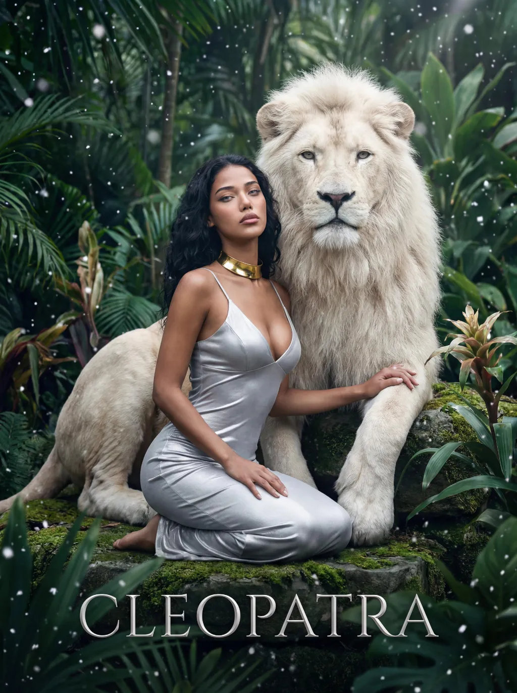 The character in the uploaded picture (unchanged facial features, gender and age). A striking woman embodying the persona of Cleopatra, seated gracefully beside a majestic white lion. She has long, wavy black hair cascading in soft waves, her eyes wide open, head tilted slightly upward, exuding an air of disdain and supreme confidence, as if looking down on all before her. The white lion, with its pure white fur and powerful build, sits calmly behind her, one paw resting gently on her shoulder, looking directly at the viewer with a calm, noble demeanor. She wears a form-fitting silver spaghetti-strap dress with a deep V-neckline, accentuating her figure. Around her neck, she wears a bold gold choker necklace. She kneels on a moss-covered stone in a lush, dense tropical jungle, one hand resting lightly on the lion's leg. The scene is filled with large, vibrant green tropical foliage (like palm fronds and monstera leaves), and delicate snowflakes are falling gently, creating a surreal and magical atmosphere. The setting is a mysterious, ancient jungle, with the air filled with falling snow, contrasting the lush greenery with the cool white of the snowflakes. At the bottom of the image, the word "CLEOPATRA" is displayed in an elegant, silver serif font. The image is rendered in a cinematic, fantasy art style, with dramatic, high-contrast lighting that highlights the sheen of the silver dress, the texture of the lion's white fur, and the richness of the green jungle. The color palette is ethereal, featuring deep greens, cool whites, and the metallic sheen of the silver and gold, creating a mysterious, regal, and timeless atmosphere. The overall aesthetic is detailed, evocative, and reminiscent of a fantasy movie poster