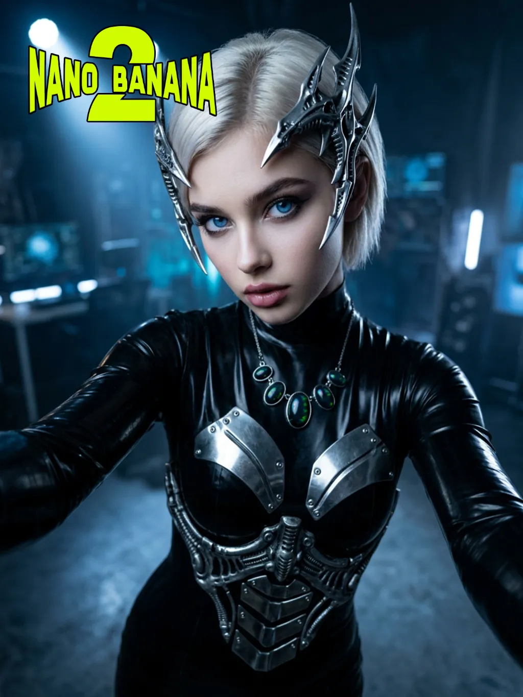 Medium close-up selfie shot: This is a set of fashion photography works with a futuristic theme, highlighting extremely futuristic silver metal headpieces and the model (the image of the model in this shot is consistent with the person in the uploaded picture, including facial features, gender and age). This is a fashion photography work belonging to the cyberpunk style. The model has platinum blonde, neatly trimmed short hair, wears a black latex tight-fitting dress, is equipped with silver metal armor plates, and has a Gothic-style exquisite makeup, exuding a sense of futurism and avant-garde. The accessories include sharp-edged biological mechanical headpieces and a necklace with glowing black opals. The model is in an energetic selfie pose, with her arms stretched forward to hold the camera, and the perspective is a high angle with a slight tilt. The background is a dark, melancholic photography studio, with cold blue spotlights penetrating the air. The overall style is simple, highly futuristic, and slightly intimidating. The photography effect is realistic, with a resolution of 8K, using film-level lighting.