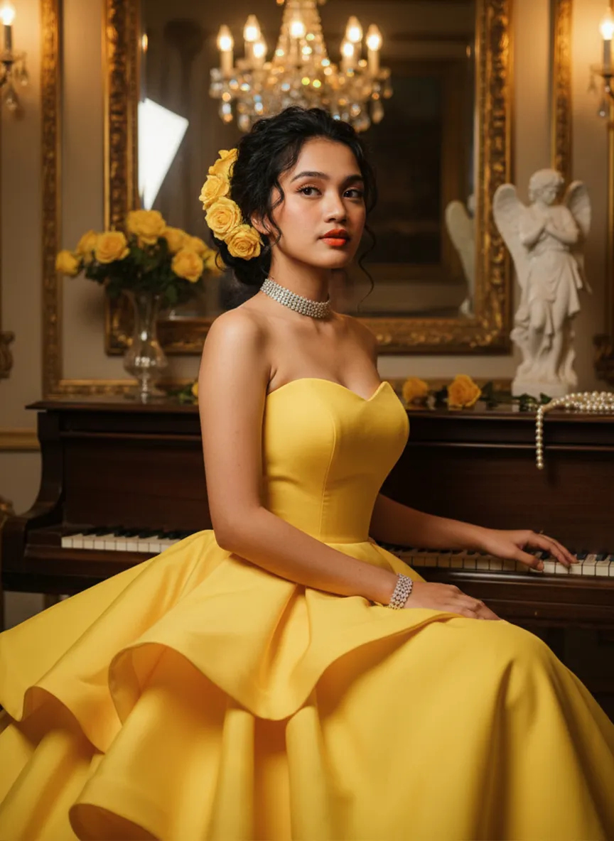 trictly lock the facial features of the uploaded portrait (preserve facial contours, native Indonesian skin tone, hairstyle and age). photorealistic 3:4 half-body portrait of a graceful young woman in her early 20s, with black curly updo adorned with yellow roses, vivid orange-red lips and soft blush makeup. She wears a strapless bright yellow ballgown with ruffled voluminous skirt, paired with diamond choker necklace and diamond bracelets. Seated by a wooden piano, set against a vintage opulent interior with gilded carved mirror, crystal chandelier, white angel statue, yellow roses and pearl strands, bathed in warm golden retro lighting, exuding classic glamorous ambiance, ultra-high detail, cinematic texture