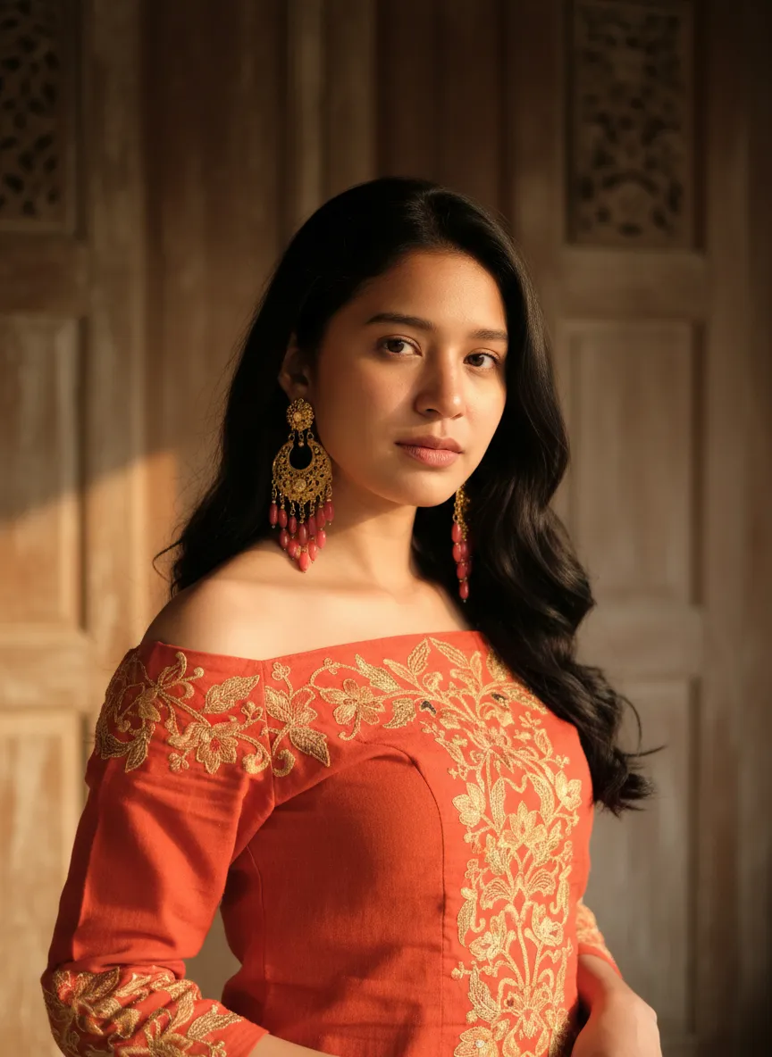 Strictly lock the facial features of the uploaded portrait (preserve facial contours, native Indonesian skin tone, hairstyle and age). A captivating close-up portrait of a young Indonesian woman in her 20s, with long flowing dark wavy hair and striking facial features, adorned with large ornate ethnic earrings and a bold orange-red off-the-shoulder batik top with intricate floral embroidery. She stands in a softly blurred rustic Indonesian wooden setting, bathed in warm golden sunlight that casts a gentle glow on her skin, creating a warm, exotic, and timeless atmosphere, photorealistic, ultra-detailed, 3:4 aspect ratio, cinematic lighting