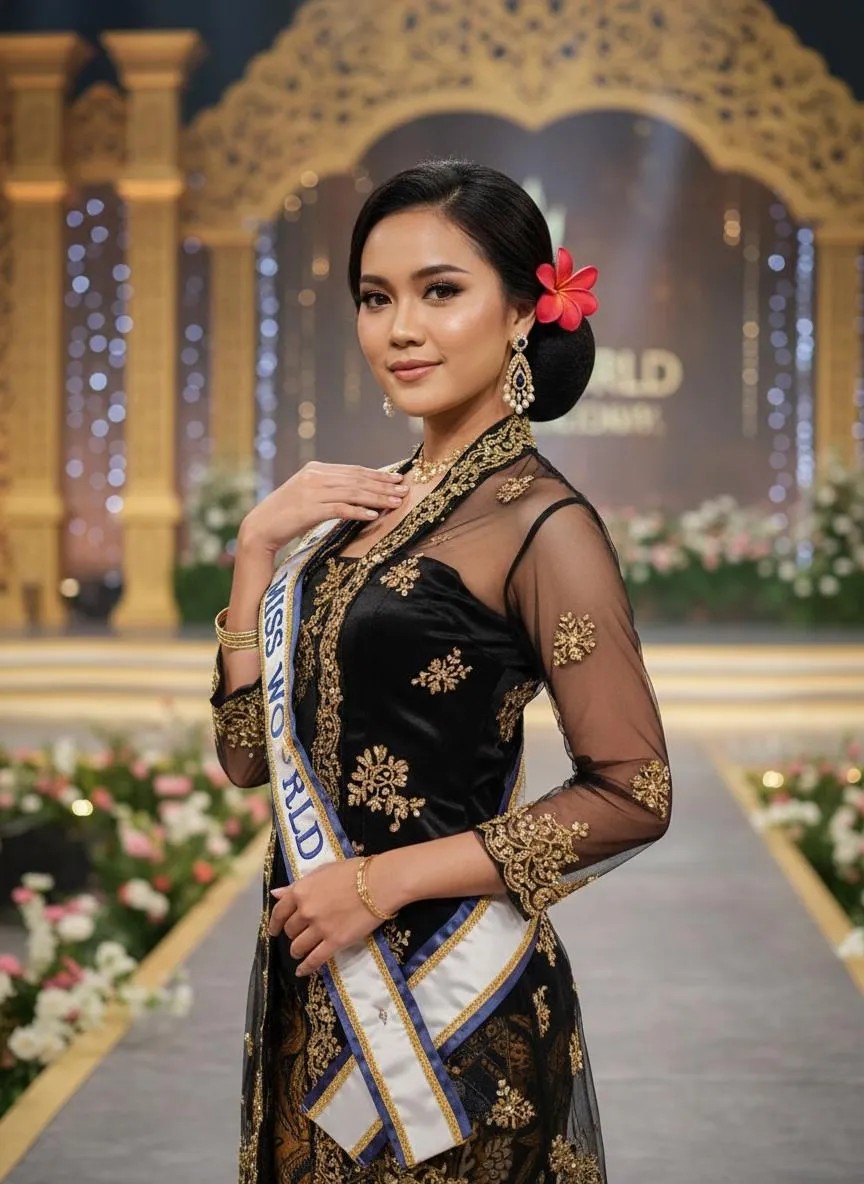 Strictly lock the facial features of the uploaded portrait (preserve facial contours, native Indonesian skin tone, hairstyle and age completely); Miss Indonesia Universe, 20s stunning Indonesian beauty, slender curvy hourglass figure with delicate waist and graceful shoulder lines, glowing dewy skin, gentle confident smile, elegant low chignon with a red plumeria pinned on the side, a few hair strands framing the jawline; wears high-end black silk kebaya top with gold tenun songket embroidery and pearl beading, sheer batik tulle overlay, iconic Miss World sash stylishly draped over one shoulder; 18K gold drop earrings inlaid with pearls and sapphires, gold plumeria choker, slim gold bangles; elegant dynamic posture - one hand on collarbone, the other slightly lifting tulle, upper body slight side turn to outline curvy lines, poised stage demeanor; rich detailed Miss World stage background with golden stage decor, soft stage spotlights, delicate luxury floral arrangements, gentle light curtains and faint pageant logo elements; professional pageant stage lighting - soft key light on face, fill light for facial and body contours, gentle backlight for delicate silhouette; 3:4 vertical bust composition, figure centered with large proportion, sharp focus on facial features and body curves, ultra-realistic, 8K HD, hyper-detailed fabric texture, cinematic pageant texture, authentic Indonesian exotic beauty, Miss World stage glamour, sophisticated noble temperament