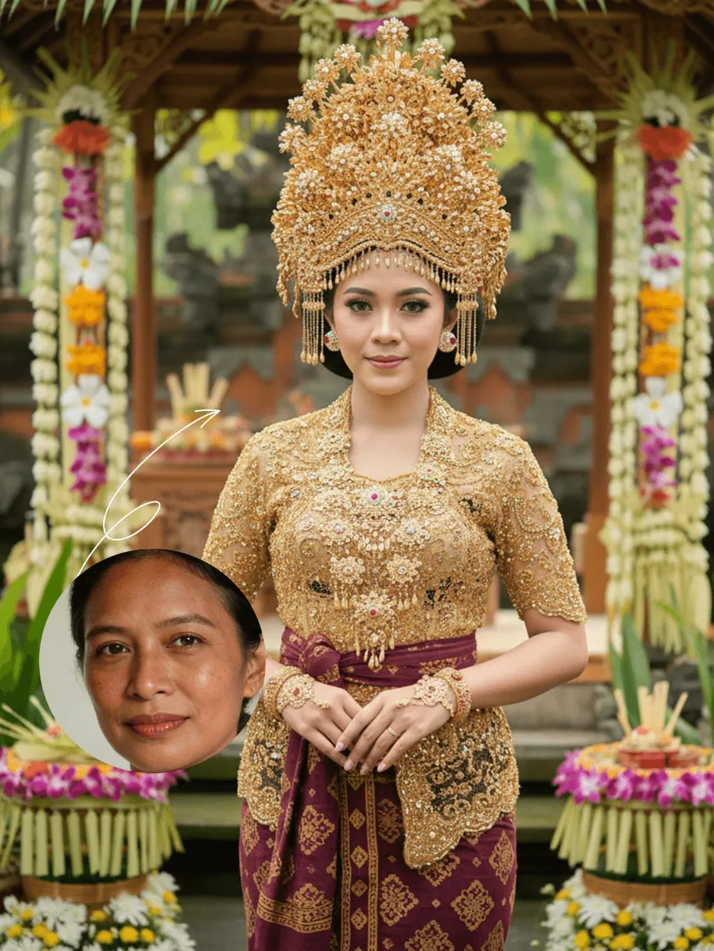 Strictly lock the facial features of the uploaded portrait (preserve facial contours, native Indonesian skin tone, hairstyle and age). Half-body portrait photography, the subject is centered in the frame, not positioned too low, hyper-realistic style, 4K ultra-high definition, soft warm tropical daylight, authentic Balinese wedding cultural atmosphere | A young Indonesian Balinese woman with a poised, elegant expression, standing front-facing in a traditional Balinese bridal outfit. She wears an extremely elaborate, oversized golden beaded and embroidered ceremonial headdress (Bali crown) adorned with intricate floral and gem details, a matching golden beaded and embroidered short-sleeve top, and a deep maroon batik-patterned sarong skirt with gold trim. She accessorizes with layered golden necklaces, bracelets, and a ceremonial handpiece, with her hands gracefully clasped in front of her torso. The background is a softly blurred authentic Balinese wedding ceremony setting: a sacred bamboo and palm-frond ceremonial pavilion (bale agung) decorated with vibrant tropical flowers (frangipani, orchids, and jasmine), a carved wooden altar adorned with traditional offerings, and lush green tropical foliage, creating a romantic and culturally immersive wedding atmosphere. Focus on the intricate details of the golden beadwork, the ornate headdress, and the timeless cultural elegance of the Balinese wedding tradition, with warm diffused sunlight enhancing the opulence of the bridal attire