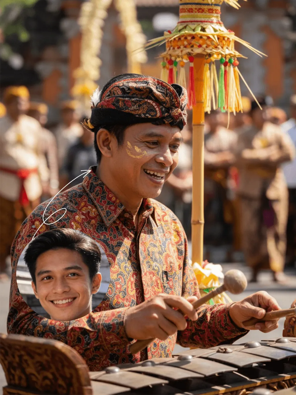 Strictly lock the identity of the uploaded portrait (preserve facial contours, native Indian skin tone, hairstyle, and age). Tight close-up half-body photorealistic shot, high-definition and detailed: A middle-aged Indonesian man wearing a vibrant traditional Batik outfit and a Balinese-style woven hat, with festive facial paint, is playing a Gamelan percussion instrument with focused and joyful expression. The background shows an outdoor Balinese traditional religious festival (e. g., Galungan) celebration, with a small shrine (Penjor) decorated with flowers and lanterns, and blurred crowds to emphasize the subject. The figure occupies over 85% of the frame, bright natural light creates a rich and lively festive atmosphere, with saturated colors and clear details