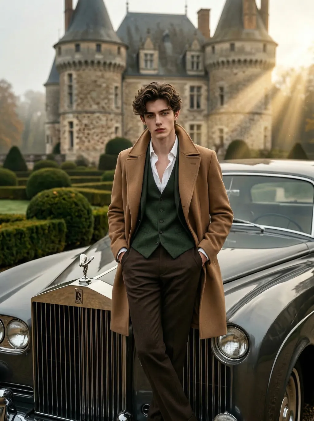 Professional Sony 8K cinematic photography, photorealistic, ultra-detailed. Keep the character's facial features from the uploaded image unchanged. He has carefully styled dark brown hair, with hands in pockets and legs crossed, leaning against a vintage dark gray luxury classic car. The front of the luxury car faces directly toward the camera, with the car logo clearly visible. The subject (the man) takes up a larger proportion of the frame. He wears a camel trench coat, layered with a dark green waistcoat and an unbuttoned white dress shirt, paired with tailored dark brown trousers. Background: a grand French chateau with neatly trimmed topiary gardens, overcast autumn atmosphere. Lighting: dramatic golden hour light with strong Tyndall effect (visible light beams), high-contrast chiaroscuro lighting on the face, deep shadows and bright highlights, full of atmosphere and cinematic sense. Style: classic men's fashion editorial, film grain, shallow depth of field, sharp focus on the subject, rich textures, vintage aesthetic.