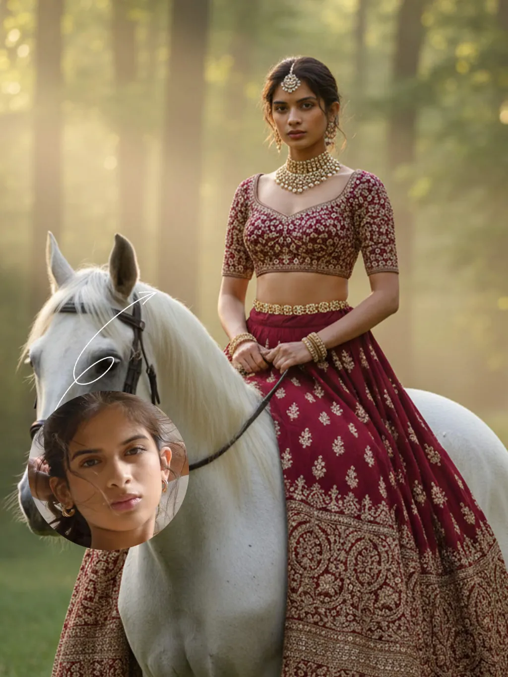 The identity of the uploaded portrait is strictly preserved (retaining facial contours, authentic Indian skin tone, hairstyle and age). Adopting a bust composition with a 3:4 aspect ratio, the head occupies a relatively larger proportion to present the facial features clearly and intuitively; this is a realistic and luxurious portrait photography work. An elegant and opulent Indian woman is dressed in a burgundy traditional Lehenga Choli embroidered with golden thread. Her blouse is encrusted with tiny rubies and pearls, the voluminous skirt drapes down in a flowing manner, and an intricately carved golden waist chain cinches her waist. She adorns her forehead with a pearl Maang Tikka, her ears with multi-layered openwork gold earrings, her neck with a gem-encrusted choker and a long necklace layered together, and her wrists are stacked with intricately carved golden bangles. She rides a pure white steed gracefully, gripping the leather reins with her hand, as the horse holds its head slightly high and steps forward unhurriedly. The background is a dense forest in the faint morning glow, with a thin layer of morning mist lingering among the trees. Golden sunlight filters through the branches and leaves, casting dappled light spots; glistening morning dew clings to the grass on the ground, and lush, scattered woods stretch into the distance. Soft natural morning light is used, with a warm and translucent tone that outlines the silhouettes of the woman and the steed, highlighting the luster of the garment’s embroidery and the smooth texture of the steed’s coat. The style is dreamy palace-inspired, the image is ultra-high definition and exquisitely detailed with abundant fine particulars and rich, saturated colors, creating an atmosphere of a tranquil and distant forest morning melody.