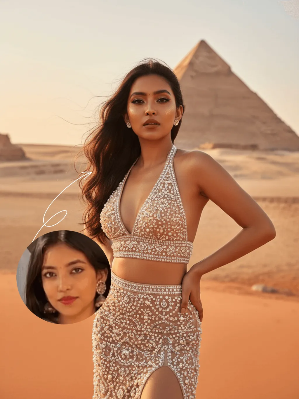 The identity of the uploaded portrait is strictly preserved (retaining facial contours, authentic Indian skin tone, hairstyle and age). This bust portrait features an Asian woman with her original untamed beauty, blessed with a striking curvy figure, her long hair falling naturally and billowing in the wind. Her makeup is a powerfully bold untamed look: a bronzed base that accentuates her healthy skin tone, heavy earth-tone smoky eyes paired with deep black eyeliner and thick, curled lashes, matte terracotta lips, and delicate gold dust dusted across her face to amplify an aura of mystery and strength. She is dressed in a nude mesh two-piece set: the top is a halter deep V bustier, and the skirt a high-slit midi one, all overlaid with delicate pearls and tiny sparkly diamonds that create a translucent, shimmering finish in the light. She stands before the Great Pyramids of Giza in Egypt, where the orange-red desert landscape and the silhouettes of the ancient pyramids complement each other, crafting a mysterious and magnificent exotic atmosphere. A soft golden halo outlines her figure from behind, as if she emanates a divine glow of her own. The key light comes from the front side, enhancing the bronzed texture of her skin and the shimmer of the pearls and diamonds on her outfit, while preserving the natural light and shadow layers of the desert setting. Her body is slightly turned, her hands resting naturally on her hips, her gaze fixed firmly on the camera with unwavering resolve, and her posture brimming with confidence and untamed sensual tension. Boasting 8K ultra-high definition, the portrait exudes the texture of a commercial-grade fashion blockbuster, with rich, saturated colors and an abundance of intricate detail and layered depth.