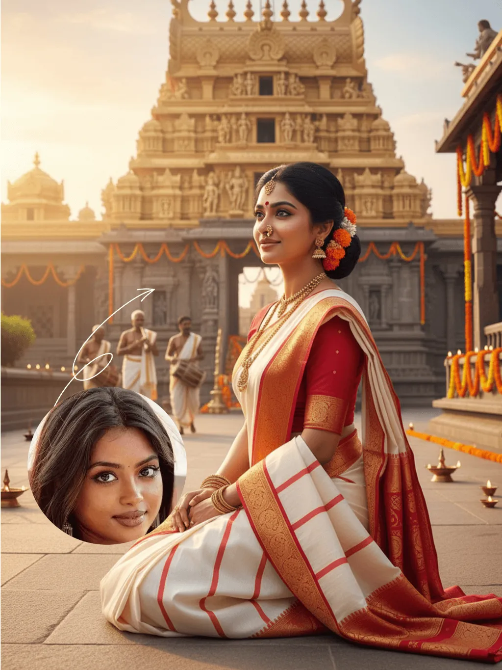 The identity of the uploaded portrait is strictly locked (retaining facial contours, authentic Indian skin tone, hairstyle and age) – the portrait identity is preserved in its entirety, along with the Indian woman’s original natural features. A close-up bust composition is adopted with a head-to-body ratio of approximately 1:2, ensuring her facial expression and demeanor are clearly visible. She has a delicate, soft and graceful face with a vermilion red bindi on her forehead. Her jet-black long hair is styled into a traditional bun, adorned with a marigold garland and gold hair ornaments. She wears an exquisite gold nose ring, necklace and earrings, exuding a faint, gentle sacred glow all around her. Draped in a traditional sari in an elegant combination of ivory white and vivid red, the sari is edged with intricate golden auspicious patterns; its lightweight, flowing fabric flutters softly in the gentle breeze. She kneels on the clean stone slabs in front of the temple with both knees, her body tilting slightly to the left, her face fully exposed to the camera. Her hands rest naturally on her knees, her head tilted slightly upward, her eyes clear and brimming with piety as she gazes intently toward the golden dome and deities of the temple, a serene smile playing on her lips, her posture dignified and solemn. Scene & Background: A South Indian-style temple (such as the Tirumala Tirupati Balaji Temple) in the early morning, where the golden temple roof glistens brilliantly in the rising sun, and the architecture is carved with elaborate and intricate deities and patterns. Colorful marigold garlands hang in front of the temple, and lit brass oil lamps are placed on the ground. In the background, several devotees in traditional attire and musicians playing classical Indian instruments can be seen, creating a sacred, solemn atmosphere infused with a festive spirit. Soft morning sunlight streams down from her side and back, casting a warm golden halo around her figure. The interplay of light and shadow on the temple architecture enhances the layering and sacredness of the frame; the hems of her sari and the tips of her hair shimmer with a faint glow. The warm radiance of the oil lamps blends with the ambient light, weaving an atmosphere of warmth and devoutness. Shot at 8K ultra-high definition with the effect of a professional portrait lens, the image features true and delicate skin texture, natural pores and fine hair details, rich and pure colors, and soft, non-glaring lighting. It presents a realistic film-grade portrait texture, highlighting the sacred and devout ambiance of the religion.