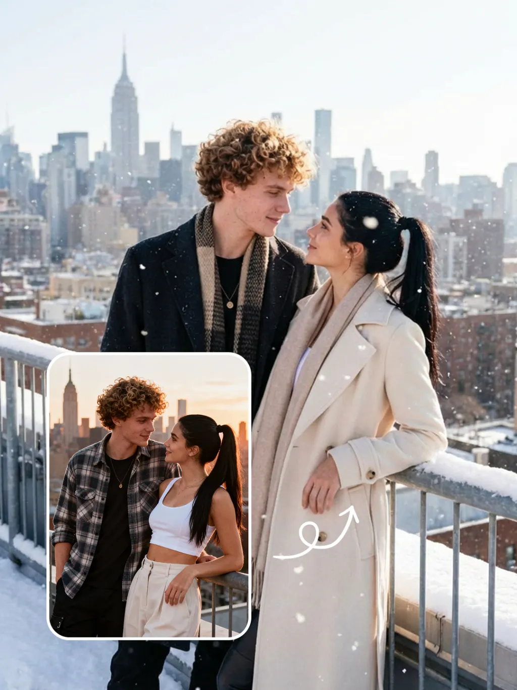Preserve the facial features of the figure in the image and transform the scene into a photo-realistic romantic winter snow photograph: the figure is wearing a matte black wool knee-length overcoat paired with a thick knit scarf in an interwoven coffee-brown and off-white check pattern (or a matte off-white wool waist-cinched double-breasted coat with gold buttons paired with a matching cashmere mid-length tassel scarf), set against a romantic outdoor scene with heavy snow falling. The lighting is bright natural light (noon sunlight), creating an exquisite and high-end atmosphere. Shoot with a 24mm wide-angle lens to highlight the immersive ambiance of the romantic realistic scene. Scene: Vintage red brick rooftops with light snow traces, frosted silver-toned metal railings with slightly melted snow on the edges; the New York skyline in the background, featuring a scattered mix of light gray glass curtain wall skyscrapers and vintage brownstone buildings with the clear spire of the Empire State Building, and fine snow falling gently. Photography: 85mm f/2.8 lens, winter side light, film texture, cool color tones. Image Quality: 8K ultra-detailed, realistic light and shadow. Atmosphere: A romantic and warm urban architectural snow scene bathed in the afterglow of the setting sun. Shooting Angle: Eye-level with a slight bird's-eye perspective.