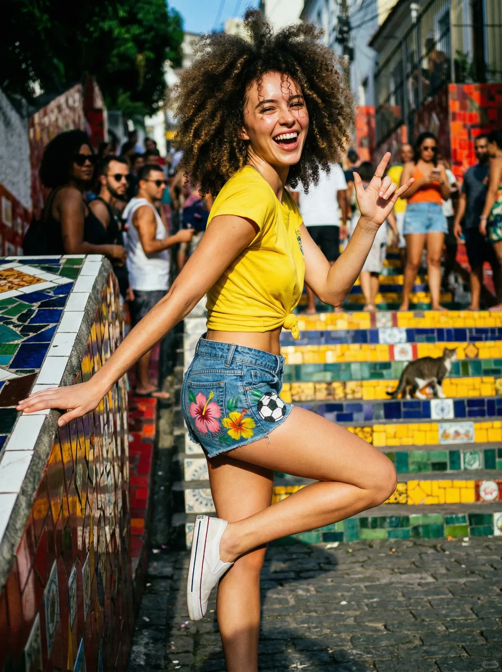 Use the exact same facial features, gender, and age as the uploaded image.A stunning Brazilian girl caught in a spontaneous samba moment on the famous colorful staircase of Santa Teresa, Rio. Natural explosive afro curls bouncing in the harsh afternoon sunlight, strands stuck to her sweaty forehead. She wears a bright yellow crop top tied at the waist, tiny denim shorts with hand-painted hibiscus and soccer ball, white canvas sneakers worn as slip-ons. She's mid-motion coming down the stairs, one hand on the railing, the other throwing the rock sign, looking back at the camera with an enormous genuine laugh. Sun directly overhead creating sharp shadows on her face. High contrast, saturated colors, real street life in background with blur onlookers and a stray cat. Authentic Rio lifestyle photography, 35mm film aesthetic, Juergen Teller energy, joyful,