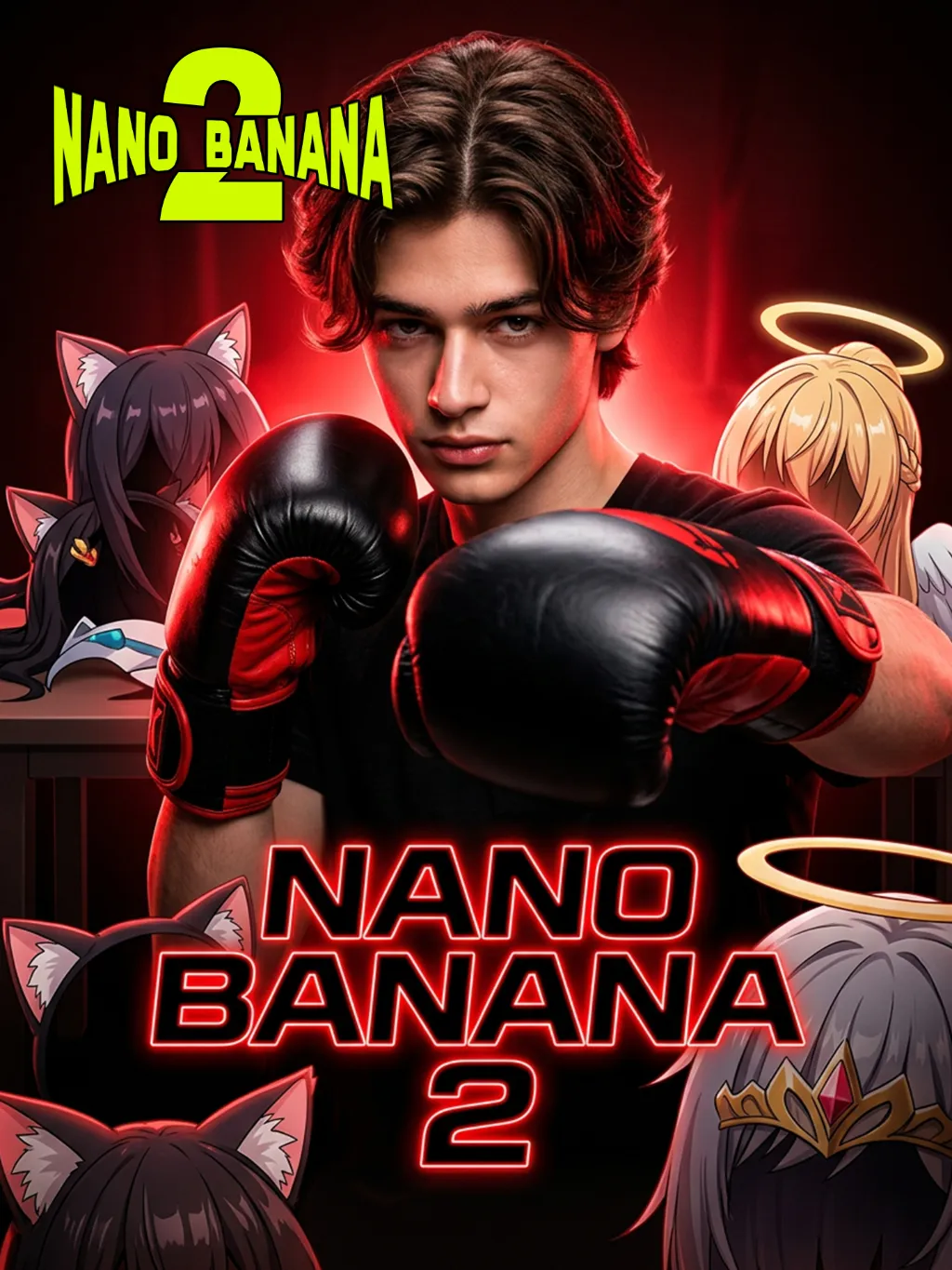 Medium-close-up shot: In the uploaded picture, the appearance (unchanged) and gender (also unchanged) of the character are clearly presented. The game promotional poster shows the outline of a mysterious fighter, wearing black boxing gloves and having a handsome and neat hairstyle. Anime character headpieces are scattered around the main character. The main color scheme is bright red and black, with highly dramatic cinematic lighting, surrounded by red-edged lights, a deep red gradient background, and in the center, there is a large, eye-catching English text "NANO BANANA 2", featuring cyberpunk style, high contrast, clear focus, high quality, 8K resolution and ultra-fine picture.