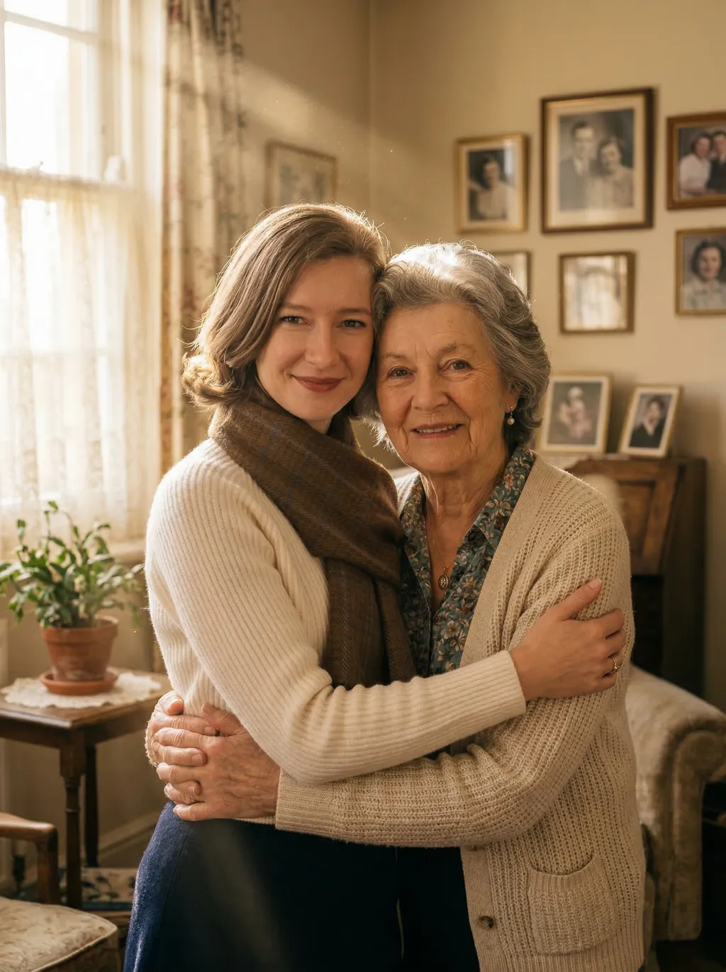 Maintain the exact same facial features, gender, and age of the two individuals from the uploaded images. Photorealistic emotional portrait: the two people embracing tightly, sharing gentle, affectionate smiles toward the camera, with their original appearance and styling fully preserved.Background: a warm and cozy home interior scene—soft wooden furniture, a few family photos on the wall, and a small potted plant on the side table, creating a familiar and intimate family atmosphere. Lighting: natural warm sunlight streaming through sheer white curtains, forming distinct, visible Tyndall effect (god rays) filling the air. The light beams gently illuminate the faces of the two people, casting soft, warm highlights on their features and creating delicate, subtle shadows, with fill light to ensure facial details are clearly visible. Cinematic film grain, documentary photography style, 8K resolution, shot with a Sony A7R V camera paired with an 85mm f/1.4 lens, shallow depth of field, hyper-detailed textures of skin, hair and clothing. No logos, watermarks, text overlays, or play buttons are present in the image.